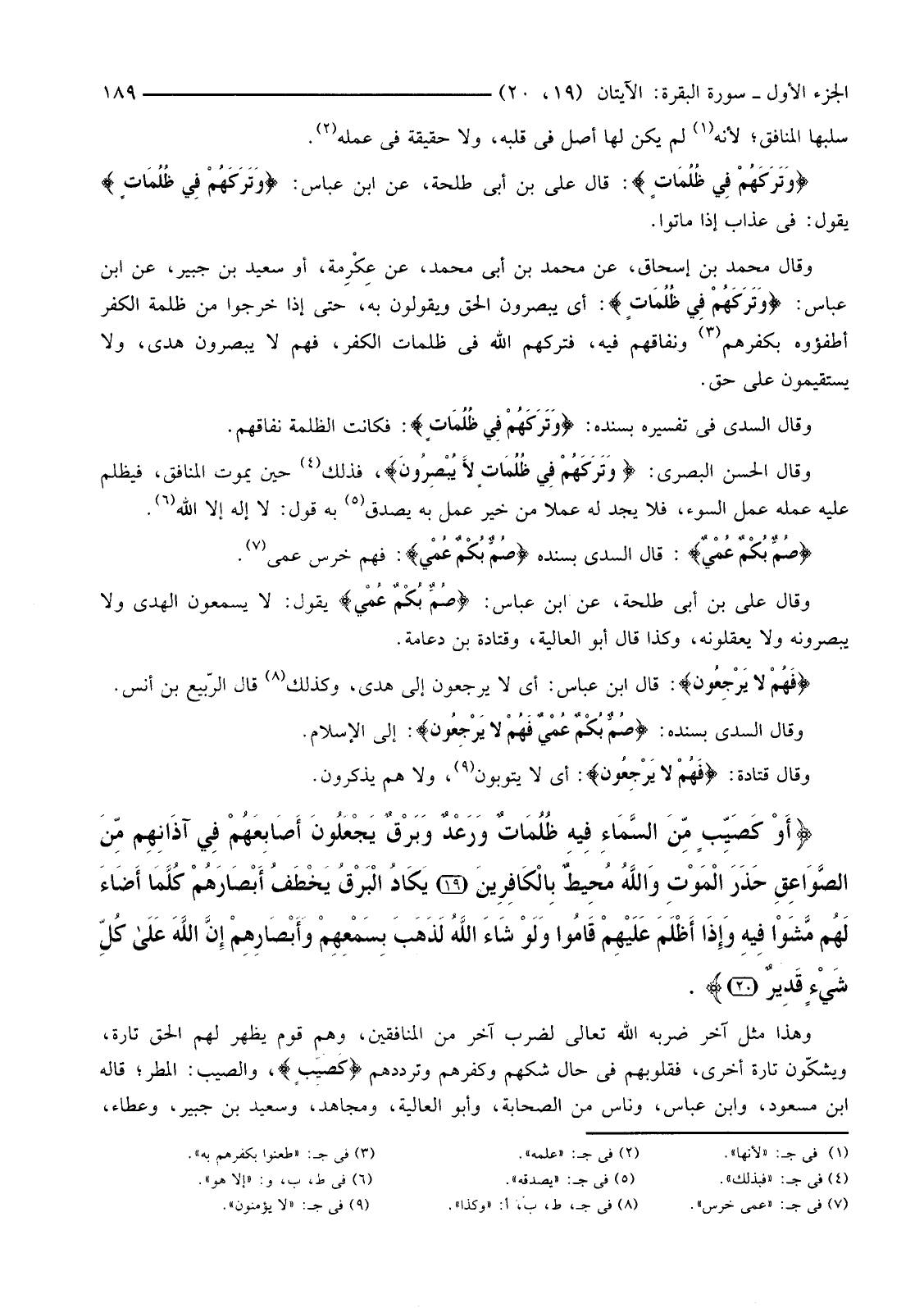 وَقَالَ مُحَمَّدُ بْنُ إِسْحَاقَ، عَنْ مُحَمَّدِ بْنِ أَبِي مُحَمَّدٍ، عَنْ عِكْرِمة، أَوْ سَعِيدِ بْنِ جبير، عن ابن عَبَّاسٍ: {وَتَرَكَهُمْ فِي ظُلُمَاتٍ} أَيْ يُبْصِرُونَ الْحَقَّ وَيَقُولُونَ بِهِ، حَتَّى إِذَا خَرَجُوا مِنْ ظُلْمَةِ الْكُفْرِ أَطْفَئُوهُ بِكُفْرِهِمْ (3) وَنِفَاقِهِمْ فِيهِ، فَتَرَكَهُمُ اللَّهُ فِي ظُلُمَاتِ الْكُفْرِ، فَهُمْ لَا يُبْصِرُونَ هُدًى، وَلَا يَسْتَقِيمُونَ عَلَى حَقٍّ.