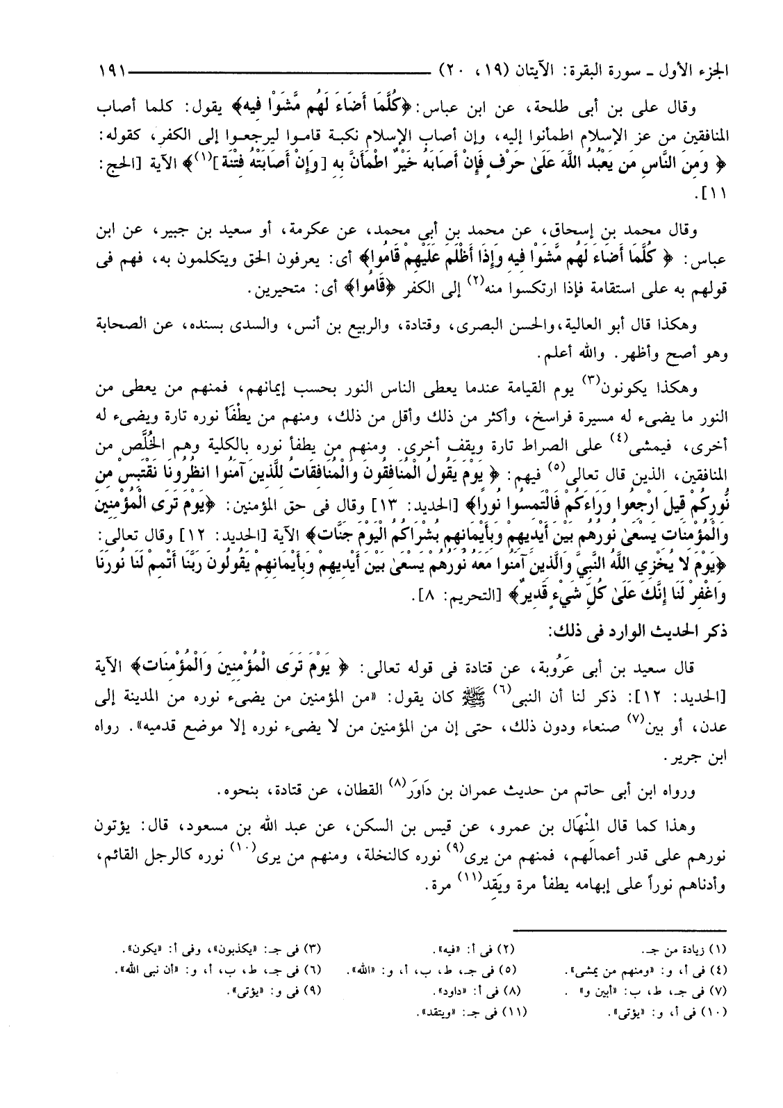 وَهَكَذَا يَكُونُونَ (3) يَوْمَ الْقِيَامَةِ عِنْدَمَا يُعْطَى النَّاسُ النُّورَ بِحَسَبِ إِيمَانِهِمْ، فَمِنْهُمْ مَنْ يُعْطَى مِنَ النُّورِ مَا يُضِيءُ لَهُ مَسِيرَةَ فَرَاسِخَ، وَأَكْثَرَ مِنْ ذَلِكَ وَأَقَلَّ مِنْ ذَلِكَ، وَمِنْهُمْ مَنْ يطْفَأ نُورُهُ تَارَةً وَيُضِيءُ لَهُ أُخْرَى، فَيَمْشِي (4) عَلَى الصِّرَاطِ تَارَةً وَيَقِفُ أُخْرَى. وَمِنْهُمْ مَنْ يُطْفَأُ نُورُهُ بِالْكُلِّيَّةِ وَهُمُ الخُلَّص مِنَ الْمُنَافِقِينَ، الَّذِينَ قَالَ تَعَالَى (5) فِيهِمْ: {يَوْمَ يَقُولُ الْمُنَافِقُونَ وَالْمُنَافِقَاتُ لِلَّذِينَ آمَنُوا انْظُرُونَا نَقْتَبِسْ مِنْ نُورِكُمْ قِيلَ ارْجِعُوا وَرَاءَكُمْ فَالْتَمِسُوا نُورًا} [الْحَدِيدِ: 13] وَقَالَ فِي حَقِّ الْمُؤْمِنِينَ: {يَوْمَ تَرَى الْمُؤْمِنِينَ وَالْمُؤْمِنَاتِ يَسْعَى نُورُهُمْ بَيْنَ أَيْدِيهِمْ وَبِأَيْمَانِهِمْ بُشْرَاكُمُ الْيَوْمَ جَنَّاتٌ} الْآيَةَ [الْحَدِيدِ: 12] ، وَقَالَ تَعَالَى: {يَوْمَ لَا يُخْزِي اللَّهُ النَّبِيَّ وَالَّذِينَ آمَنُوا مَعَهُ نُورُهُمْ يَسْعَى بَيْنَ أَيْدِيهِمْ وَبِأَيْمَانِهِمْ يَقُولُونَ رَبَّنَا أَتْمِمْ لَنَا نُورَنَا وَاغْفِرْ لَنَا إِنَّكَ عَلَى كُلِّ شَيْءٍ قَدِيرٌ} [التَّحْرِيمِ: 8] .