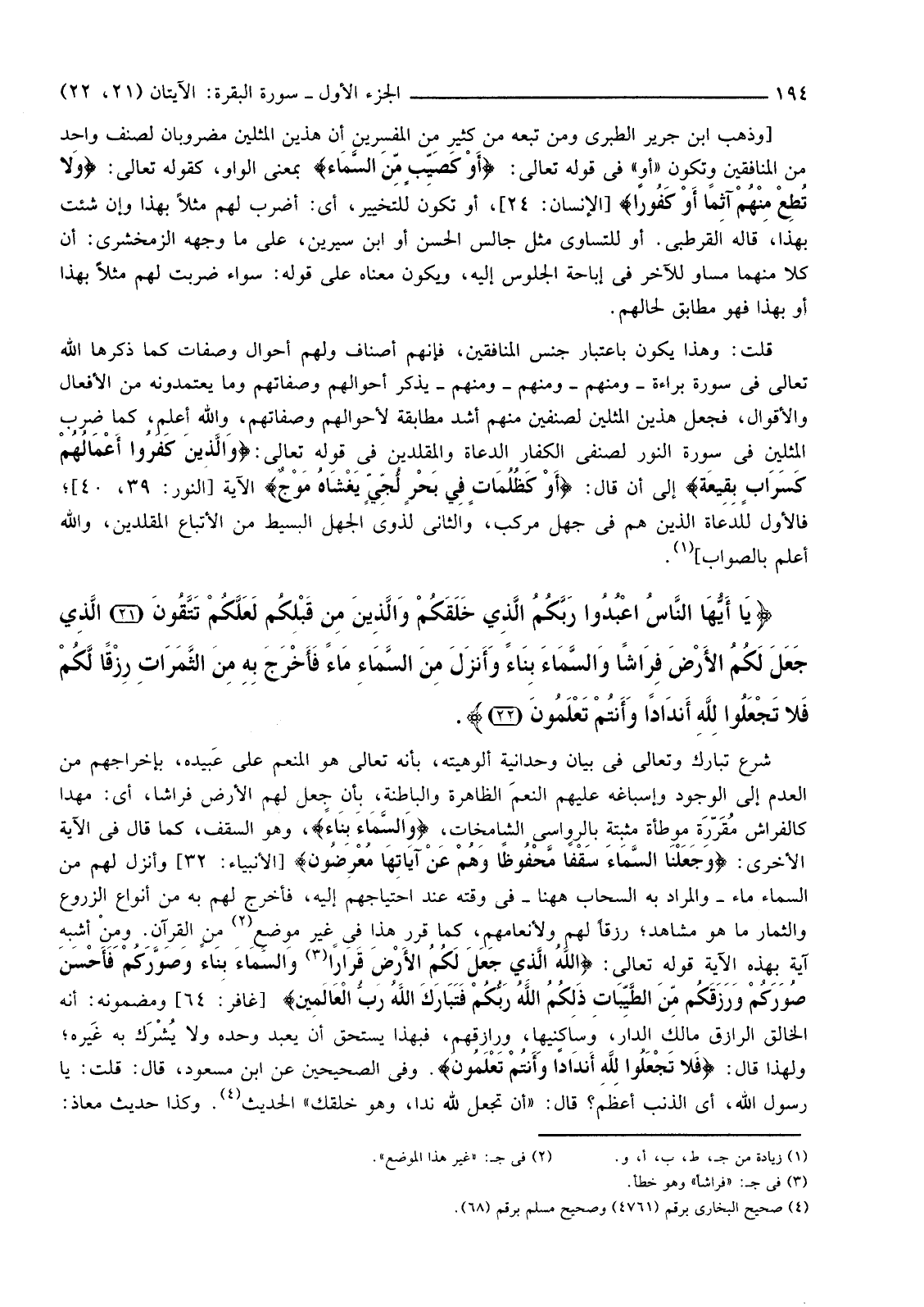 {يَا أَيُّهَا النَّاسُ اعْبُدُوا رَبَّكُمُ الَّذِي خَلَقَكُمْ وَالَّذِينَ مِنْ قَبْلِكُمْ لَعَلَّكُمْ تَتَّقُونَ (21) الَّذِي جَعَلَ لَكُمُ الأرْضَ فِرَاشًا وَالسَّمَاءَ بِنَاءً وَأَنزلَ مِنَ السَّمَاءِ مَاءً فَأَخْرَجَ بِهِ مِنَ الثَّمَرَاتِ رِزْقًا لَكُمْ فَلا تَجْعَلُوا لِلَّهِ أَنْدَادًا وَأَنْتُمْ تَعْلَمُونَ (22) }
