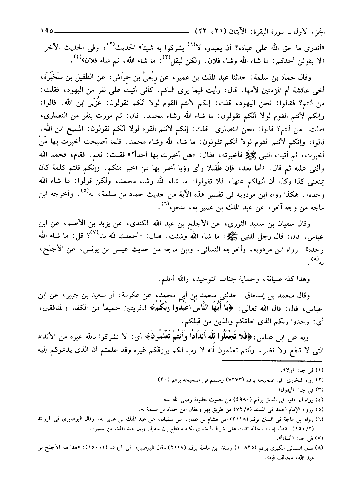 وَقَالَ حَمَّادُ بْنُ سَلَمَةَ: حَدَّثَنَا عَبْدُ الْمَلِكِ بْنُ عُمَيْرٍ، عَنْ رِبْعيِّ بْنِ حِرَاش، عَنِ الطُّفَيْلِ بْنِ سَخْبَرَة، أَخِي عَائِشَةَ أُمِّ الْمُؤْمِنِينَ لِأُمِّهَا، قَالَ: رَأَيْتُ فِيمَا يَرَى النَّائِمُ، كَأَنِّي أَتَيْتُ عَلَى نَفَرٍ مِنَ الْيَهُودِ، فَقُلْتُ: مَنْ أَنْتُمْ؟ فَقَالُوا: نَحْنُ الْيَهُودُ، قُلْتُ: إِنَّكُمْ لَأَنْتُمُ الْقَوْمُ لَوْلَا أَنَّكُمْ تَقُولُونَ: عُزَير ابْنُ اللَّهِ. قَالُوا: وَإِنَّكُمْ لَأَنْتُمُ الْقَوْمُ لَوْلَا أَنَّكُمْ تَقُولُونَ: مَا شَاءَ اللَّهُ وَشَاءَ مُحَمَّدٌ. قَالَ: ثُمَّ مَرَرْتُ بِنَفَرٍ مِنَ النَّصَارَى، فَقُلْتُ: مَنْ أَنْتُمْ؟ قَالُوا: نَحْنُ النَّصَارَى. قُلْتُ: إِنَّكُمْ لَأَنْتُمُ الْقَوْمُ لَوْلَا أَنَّكُمْ تَقُولُونَ: الْمَسِيحُ ابْنُ اللَّهِ. قَالُوا: وَإِنَّكُمْ لَأَنْتُمُ الْقَوْمُ لَوْلَا أَنَّكُمْ تَقُولُونَ: مَا شَاءَ اللَّهُ وَشَاءَ مُحَمَّدٌ. فَلَمَّا أَصْبَحْتُ أَخْبَرْتُ بِهَا مَنْ أَخْبَرْتُ، ثُمَّ أَتَيْتُ النَّبِيَّ صَلَّى اللَّهُ عَلَيْهِ وَسَلَّمَ فَأَخْبَرْتُهُ، فَقَالَ: "هَلْ أَخْبَرْتَ بِهَا أَحَدًا؟ " فَقُلْتُ: نَعَمْ. فَقَامَ، فَحَمِدَ اللَّهَ وَأَثْنَى عَلَيْهِ ثُمَّ قَالَ: "أَمَّا بَعْدُ، فَإِنَّ طُفيلا رَأَى رُؤْيَا أَخْبَرَ بِهَا مَنْ أَخْبَرَ مِنْكُمْ، وَإِنَّكُمْ قُلْتُمْ كَلِمَةً كَانَ يَمْنَعُنِي كَذَا وَكَذَا أَنْ أَنْهَاكُمْ عَنْهَا، فَلَا تَقُولُوا: مَا شَاءَ اللَّهُ وَشَاءَ مُحَمَّدٌ، وَلَكِنْ قُولُوا: مَا شَاءَ اللَّهُ وَحْدَهُ". هَكَذَا رَوَاهُ ابْنُ مَرْدَوَيْهِ فِي تَفْسِيرِ هَذِهِ الْآيَةِ مِنْ حَدِيثِ حَمَّادِ بْنِ سَلَمَةَ، بِهِ (5) . وَأَخْرَجَهُ ابْنُ مَاجَهْ مِنْ وَجْهٍ آخَرَ، عَنْ عَبْدِ الْمَلِكِ بْنِ عُمَيْرٍ بِهِ، بِنَحْوِهِ (6) .