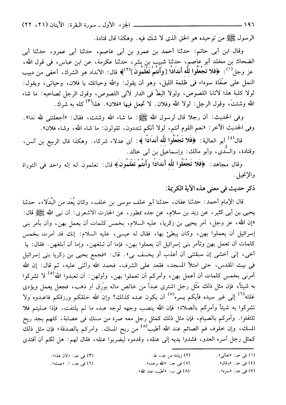 وَقَالَ ابْنُ أَبِي حَاتِمٍ: حَدَّثَنَا أَحْمَدُ بْنُ عَمْرِو بْنِ أَبِي عَاصِمٍ، حَدَّثَنَا أَبِي عَمْرٌو، حَدَّثَنَا أَبِي الضَّحَّاكُ بْنُ مَخْلَدٍ أَبُو عَاصِمٍ، حَدَّثَنَا شَبِيبُ بْنُ بِشْرٍ، حَدَّثَنَا عِكْرِمَةَ، عَنِ ابْنِ عَبَّاسٍ، فِي قَوْلِ اللَّهِ، عَزَّ وَجَلَّ (1) {فَلا تَجْعَلُوا لِلَّهِ أَنْدَادًا [وَأَنْتُمْ تَعْلَمُونَ] (2) } قَالَ: الْأَنْدَادُ هُوَ الشِّرْكُ، أَخْفَى مِنْ دَبِيبِ النَّمْلِ عَلَى صَفَاة سَوْدَاءٍ فِي ظُلْمَةِ اللَّيْلِ، وَهُوَ أَنْ يَقُولَ: وَاللَّهِ وَحَيَاتِكَ يَا فُلَانُ، وَحَيَاتِي، وَيَقُولُ: لَوْلَا كَلْبَةُ هَذَا لَأَتَانَا اللُّصُوصُ، وَلَوْلَا الْبَطُّ فِي الدَّارِ لَأَتَى اللُّصُوصُ، وَقَوْلُ الرَّجُلِ لِصَاحِبِهِ: مَا شَاءَ اللَّهُ وشئتَ، وَقَوْلُ الرَّجُلِ: لَوْلَا اللَّهُ وَفُلَانٌ. لَا تَجْعَلُ فِيهَا "فُلَانَ". هَذَا (3) كُلُّهُ بِهِ شِرْكٌ.