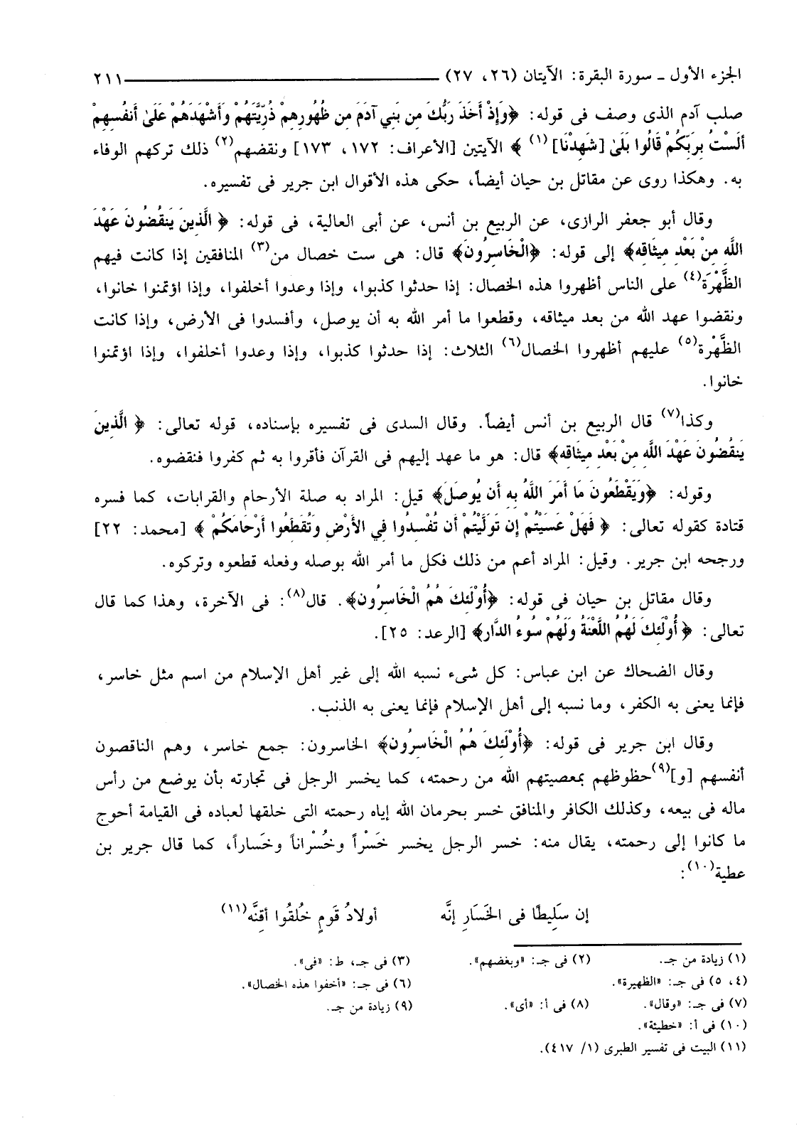 وَكَذَا (7) قَالَ الرَّبِيعُ بْنُ أَنَسٍ أَيْضًا. وَقَالَ السُّدِّيُّ فِي تَفْسِيرِهِ بِإِسْنَادِهِ، قَوْلَهُ تَعَالَى: {الَّذِينَ يَنْقُضُونَ عَهْدَ اللَّهِ مِنْ بَعْدِ مِيثَاقِهِ} قَالَ: هُوَ مَا عَهِدَ إِلَيْهِمْ فِي الْقُرْآنِ فَأَقَرُّوا بِهِ ثُمَّ كَفَرُوا فَنَقَضُوهُ.
