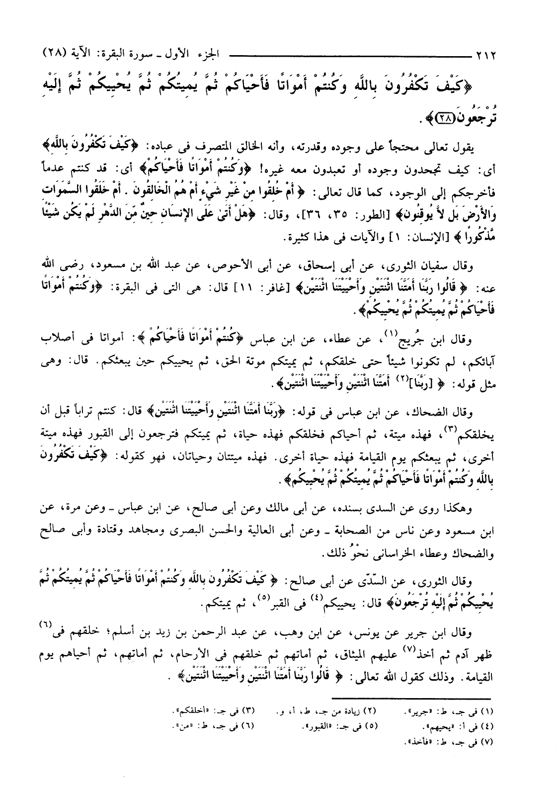 وَقَالَ الثَّوْرِيُّ، عَنِ السُّدِّيِّ عَنْ أَبِي صَالِحٍ: {كَيْفَ تَكْفُرُونَ بِاللَّهِ وَكُنْتُمْ أَمْوَاتًا فَأَحْيَاكُمْ ثُمَّ يُمِيتُكُمْ ثُمَّ يُحْيِيكُمْ ثُمَّ إِلَيْهِ تُرْجَعُونَ} قَالَ: يُحْيِيكُمْ (4) فِي الْقَبْرِ (5) ، ثُمَّ يُمِيتُكُمْ.