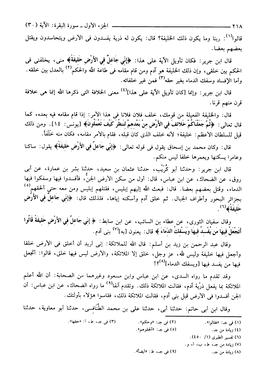 قَالَ ابْنُ جَرِيرٍ: فَكَانَ تَأْوِيلُ الْآيَةِ عَلَى هَذَا: {إِنِّي جَاعِلٌ فِي الأرْضِ خَلِيفَةً} مِنِّي، يَخْلُفُنِي فِي الْحُكْمِ بَيْنَ خَلْقِي، وَإِنَّ ذَلِكَ الْخَلِيفَةَ هُوَ آدَمُ وَمَنْ قَامَ مَقَامَهُ فِي طَاعَةِ اللَّهِ وَالْحُكْمِ (2) بِالْعَدْلِ بَيْنَ خَلْقِهِ. وَأَمَّا الْإِفْسَادُ وَسَفْكُ الدِّمَاءِ بِغَيْرِ حَقِّهَا (3) فَمِنْ غَيْرِ خُلَفَائِهِ.