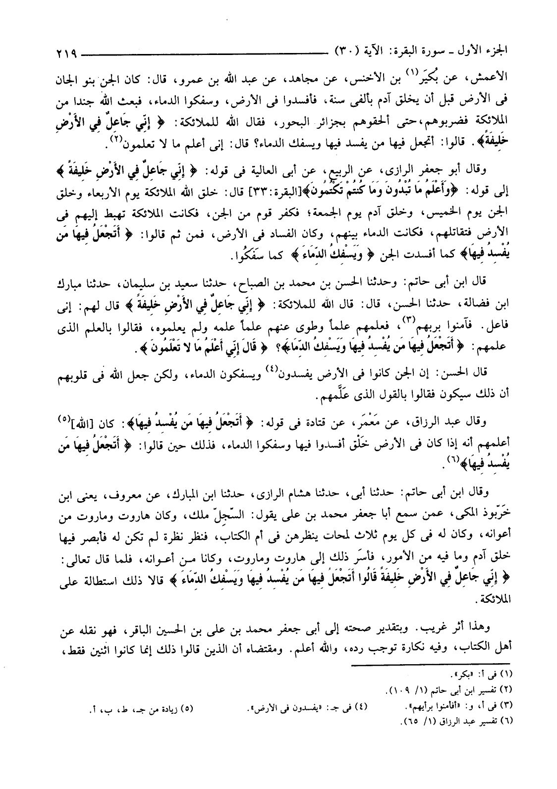 وَقَالَ أَبُو جَعْفَرٍ الرَّازِيُّ، عَنِ الرَّبِيعِ، عَنْ أَبِي الْعَالِيَةِ فِي قَوْلِهِ: {إِنِّي جَاعِلٌ فِي الأرْضِ خَلِيفَةً} إِلَى قَوْلِهِ: {وَأَعْلَمُ مَا تُبْدُونَ وَمَا كُنْتُمْ تَكْتُمُونَ} [الْبَقَرَةِ: 33] قَالَ: خَلَقَ اللَّهُ الْمَلَائِكَةَ يَوْمَ الْأَرْبِعَاءِ وَخَلْقَ الْجِنَّ يَوْمَ الْخَمِيسِ، وَخَلَقَ آدَمَ يَوْمَ الْجُمُعَةِ؛ فَكَفَرَ قَوْمٌ مِنَ الْجِنِّ، فَكَانَتِ الْمَلَائِكَةُ تَهْبِطُ إِلَيْهِمْ فِي الْأَرْضِ فَتُقَاتِلُهُمْ، فَكَانَتِ الدِّمَاءُ بَيْنَهُمْ، وَكَانَ الْفَسَادُ فِي الْأَرْضِ، فَمِنْ ثَمَّ قَالُوا: {أَتَجْعَلُ فِيهَا مَنْ يُفْسِدُ فِيهَا} كَمَا أَفْسَدَتِ الْجِنُّ {وَيَسْفِكُ الدِّمَاءَ} كَمَا سَفَكُوا.