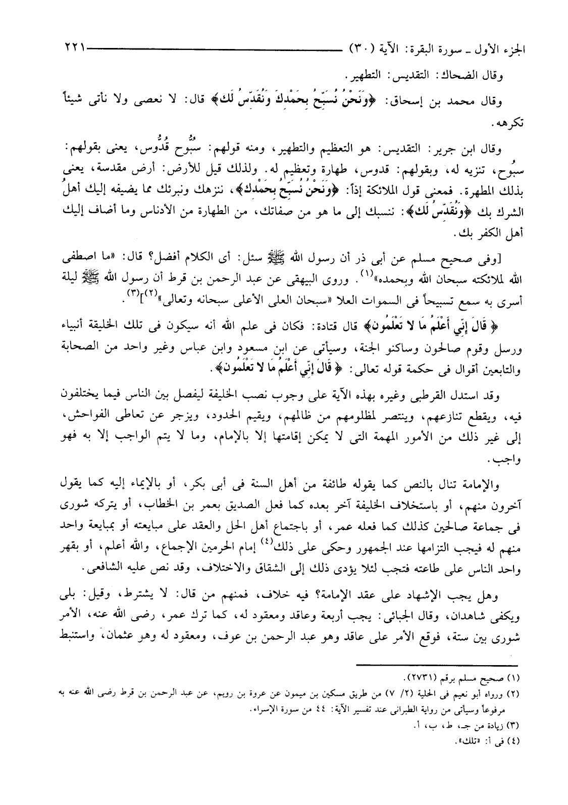 وَقَالَ ابْنُ جَرِيرٍ: التَّقْدِيسُ: هُوَ التَّعْظِيمُ وَالتَّطْهِيرُ، وَمِنْهُ قَوْلُهُمْ: سُبُّوح قُدُّوس، يَعْنِي بِقَوْلِهِمْ: سُبوح، تَنْزِيهٌ لَهُ، وَبِقَوْلِهِمْ: قُدُّوسٌ، طَهَارَةٌ وَتَعْظِيمٌ لَهُ. وَلِذَلِكَ قِيلَ لِلْأَرْضِ: أَرْضٌ مُقَدَّسَةٌ، يَعْنِي بِذَلِكَ الْمُطَهَّرَةَ. فَمَعْنَى قَوْلِ الْمَلَائِكَةِ إِذًا: {وَنَحْنُ نُسَبِّحُ بِحَمْدِكَ} نُنَزِّهُكَ وَنُبَرِّئُكَ مِمَّا يُضِيفُهُ إِلَيْكَ أهلُ الشِّرْكِ بِكَ {وَنُقَدِّسُ لَكَ} نَنْسِبُكَ إِلَى مَا هُوَ مِنْ صِفَاتِكَ، مِنَ الطَّهَارَةِ مِنَ الْأَدْنَاسِ وَمَا أَضَافَ إِلَيْكَ أَهْلُ الْكُفْرِ بِكَ.