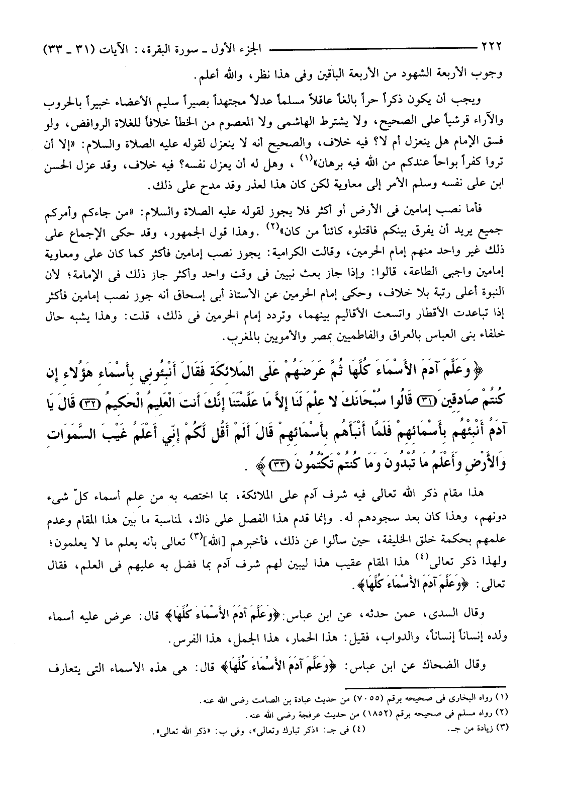 {وَعَلَّمَ آدَمَ الأسْمَاءَ كُلَّهَا ثُمَّ عَرَضَهُمْ عَلَى الْمَلائِكَةِ فَقَالَ أَنْبِئُونِي بِأَسْمَاءِ هَؤُلاءِ إِنْ كُنْتُمْ صَادِقِينَ (31) قَالُوا سُبْحَانَكَ لَا عِلْمَ لَنَا إِلا مَا عَلَّمْتَنَا إِنَّكَ أَنْتَ الْعَلِيمُ الْحَكِيمُ (32) قَالَ يَا آدَمُ أَنْبِئْهُمْ بِأَسْمَائِهِمْ فَلَمَّا أَنْبَأَهُمْ بِأَسْمَائِهِمْ قَالَ أَلَمْ أَقُلْ لَكُمْ إِنِّي أَعْلَمُ غَيْبَ السَّمَاوَاتِ وَالأرْضِ وَأَعْلَمُ مَا تُبْدُونَ وَمَا كُنْتُمْ تَكْتُمُونَ (33) }