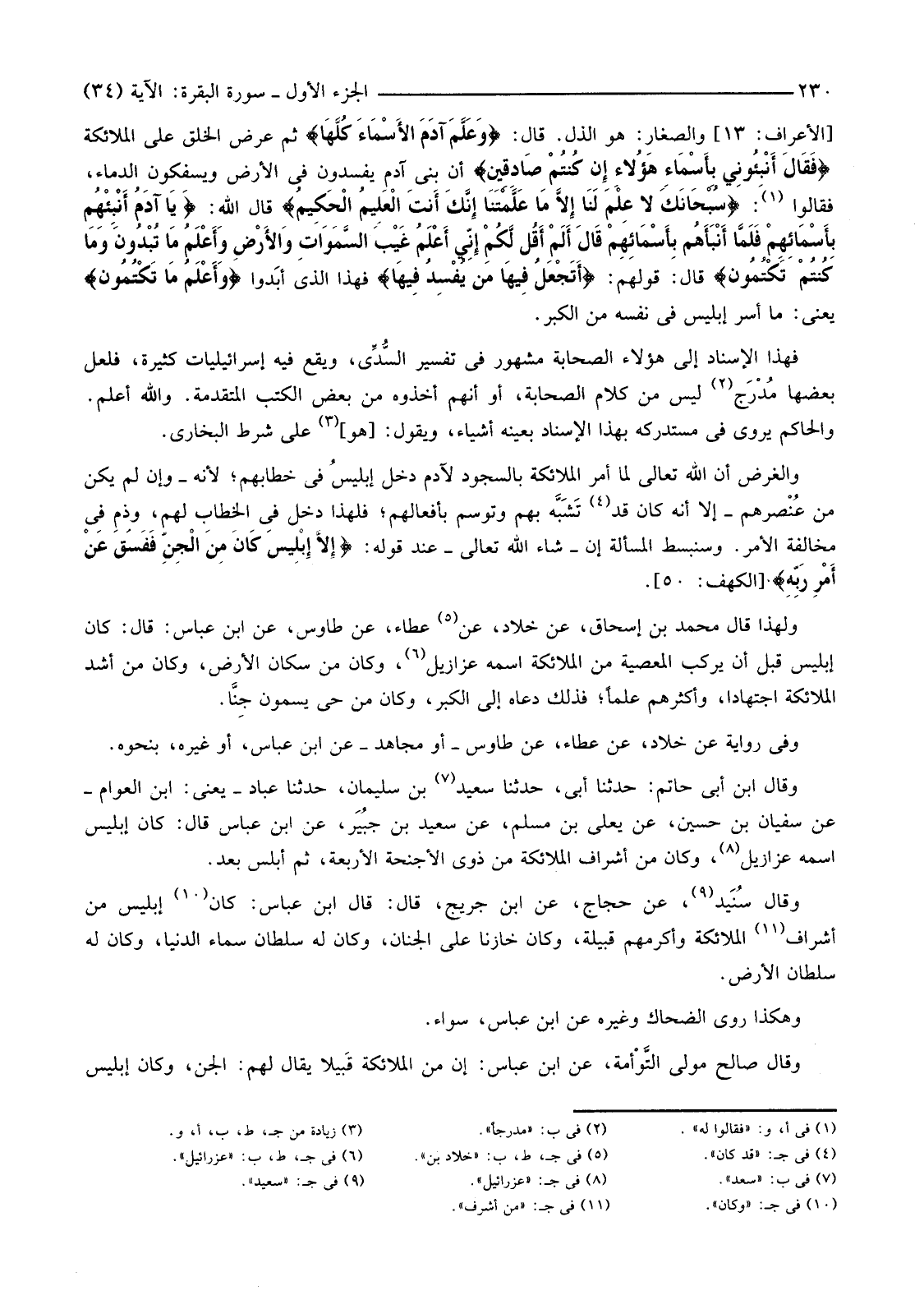 وَقَالَ سُنَيْد (9) ، عَنْ حَجَّاجٍ، عَنِ ابْنِ جُرَيْجٍ، قَالَ: قَالَ ابْنُ عَبَّاسٍ: كَانَ (10) إِبْلِيسُ مِنْ أَشْرَافِ (11) الْمَلَائِكَةِ وَأَكْرَمُهُمْ قَبِيلَةً، وَكَانَ خَازِنًا عَلَى الْجِنَانِ، وَكَانَ لَهُ سُلْطَانُ سَمَاءِ الدُّنْيَا، وَكَانَ لَهُ سُلْطَانُ الْأَرْضِ.