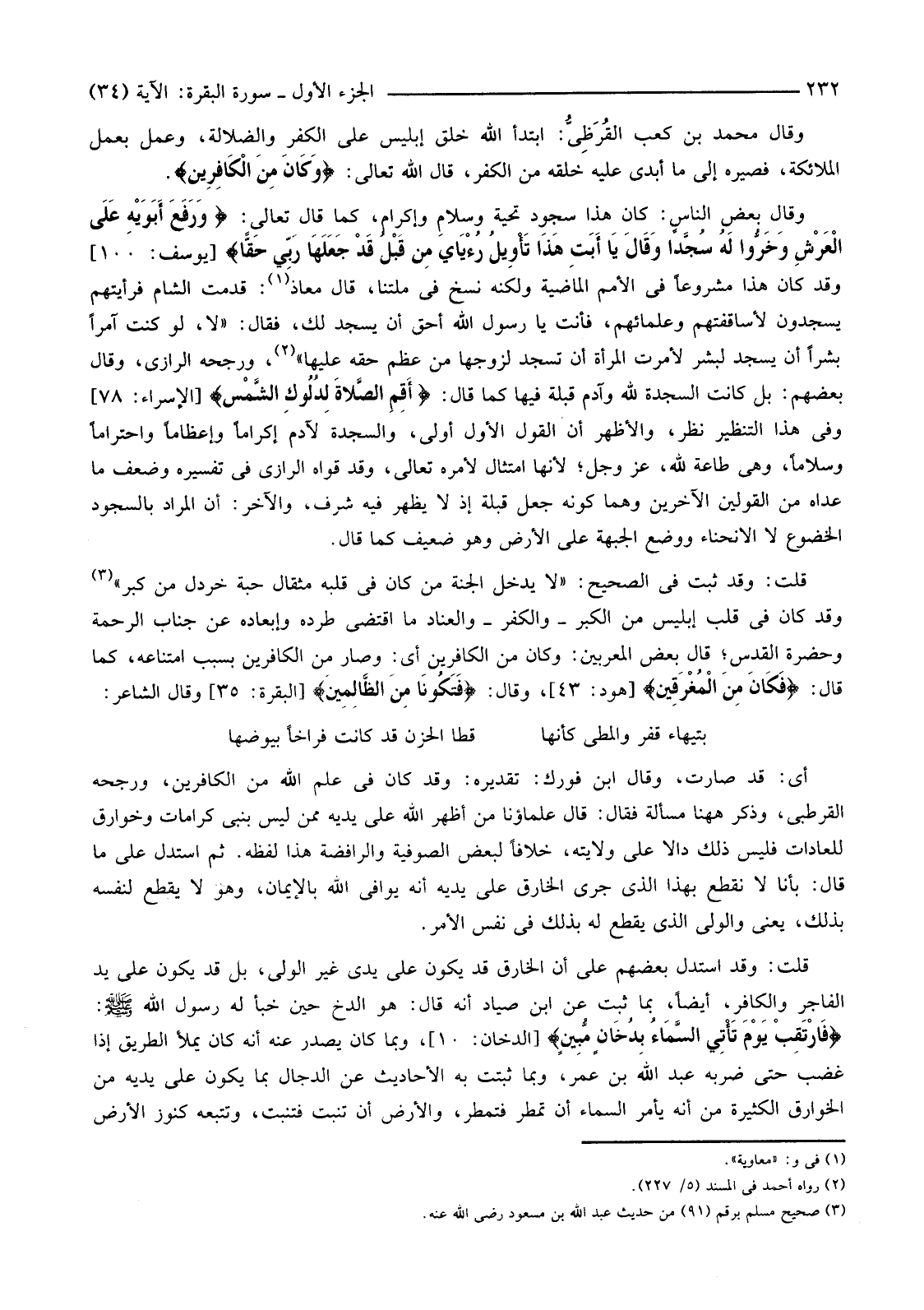 قُلْتُ: وَقَدْ ثَبَتَ فِي الصَّحِيحِ: "لَا يَدْخُلُ الْجَنَّةَ مَنْ كَانَ فِي قَلْبِهِ مِثْقَالُ حَبَّةِ خَرْدَلٍ مِنْ كِبْرٍ" (3) وَقَدْ كَانَ فِي قَلْبِ إِبْلِيسَ مِنَ الْكِبْرِ -وَالْكُفْرِ -وَالْعِنَادِ مَا اقْتَضَى طَرْدَهُ وَإِبْعَادَهُ عَنْ جَنَابِ الرَّحْمَةِ وَحَضْرَةِ الْقُدْسِ؛ قَالَ بَعْضُ الْمُعْرِبِينَ: وَكَانَ مِنَ الْكَافِرِينَ أَيْ: وَصَارَ مِنَ الْكَافِرِينَ بِسَبَبِ امْتِنَاعِهِ، كَمَا قَالَ: {فَكَانَ مِنَ الْمُغْرَقِينَ} [هُودٍ: 43] وَقَالَ {فَتَكُونَا مِنَ الظَّالِمِينَ} [الْبَقَرَةِ: 35] وَقَالَ الشَّاعِرُ: