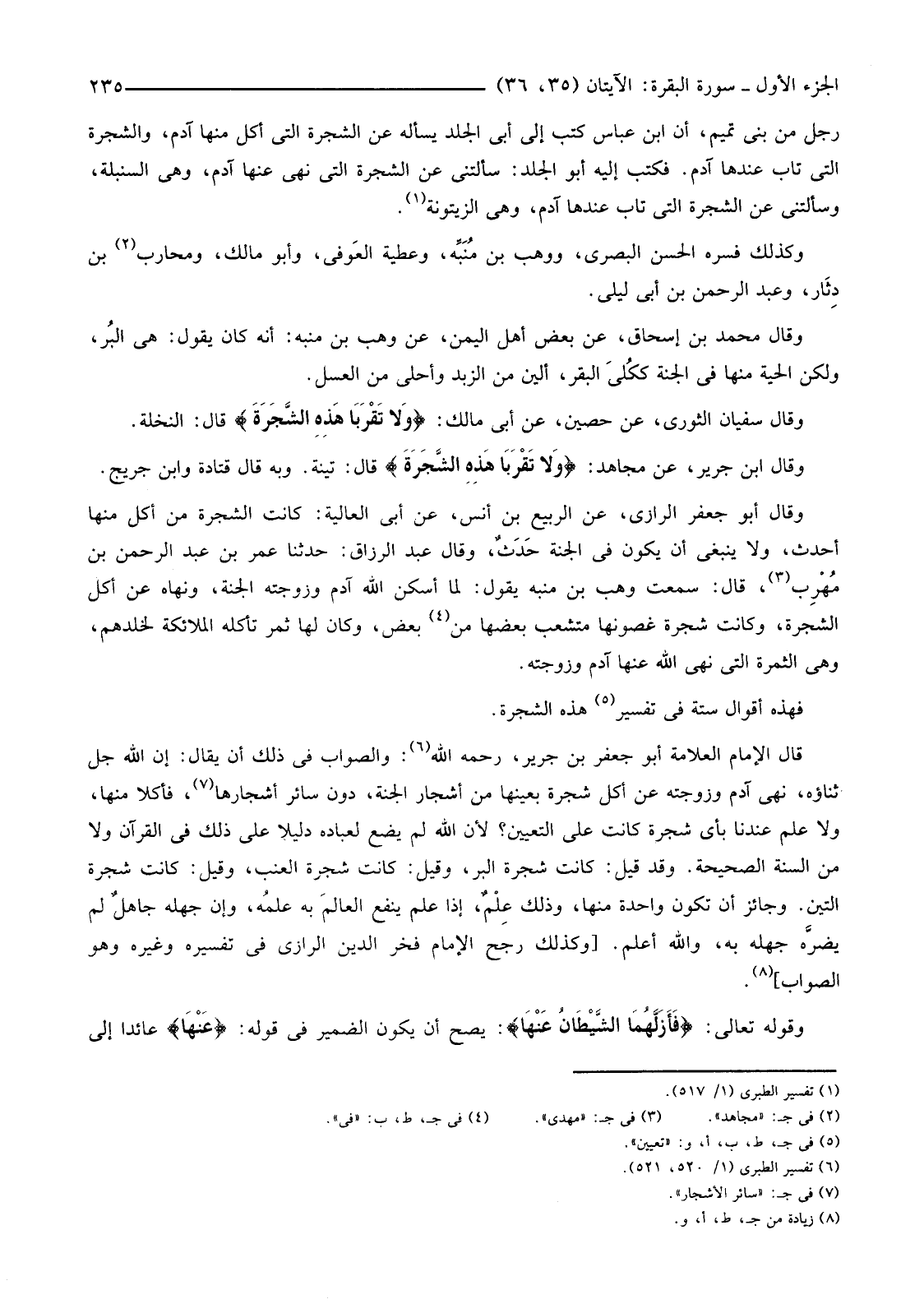 قَالَ الْإِمَامُ الْعَلَّامَةُ أَبُو جَعْفَرِ بْنُ جَرِيرٍ، رَحِمَهُ اللَّهُ (6) : وَالصَّوَابُ فِي ذَلِكَ أَنْ يُقَالَ: إِنَّ اللَّهَ جَلَّ ثَنَاؤُهُ نَهَى آدَمَ وَزَوْجَتَهُ عَنْ أَكْلِ شَجَرَةٍ بِعَيْنِهَا مِنْ أَشْجَارِ الْجَنَّةِ، دُونَ سَائِرِ أَشْجَارِهَا (7) ، فَأَكَلًا مِنْهَا، وَلَا عِلْمَ عِنْدِنَا بِأَيِّ شَجَرَةٍ كَانَتْ عَلَى التَّعْيِينِ؟ لِأَنَّ اللَّهَ لَمْ يَضَعْ لِعِبَادِهِ دَلِيلًا عَلَى ذَلِكَ فِي الْقُرْآنِ وَلَا مِنَ السُّنَّةِ الصَّحِيحَةِ. وَقَدْ قِيلَ: كَانَتْ شَجَرَةَ الْبُرِّ. وَقِيلَ: كَانَتْ شَجَرَةَ الْعِنَبِ، وَقِيلَ: كَانَتْ شَجَرَةَ التِّينِ. وَجَائِزٌ أَنْ تَكُونَ وَاحِدَةً مِنْهَا، وَذَلِكَ عِلْمٌ، إِذَا عُلِمَ يَنْفَعُ العالمَ بِهِ علمُه، وَإِنْ جَهِلَهُ جاهلٌ لَمْ يضرَّه جَهْلُهُ بِهِ، وَاللَّهُ أَعْلَمُ. [وَكَذَلِكَ رَجَّحَ الْإِمَامُ فَخْرُ الدِّينِ الرَّازِيُّ فِي تفسيره وغيره، وهو الصواب] (8) .
