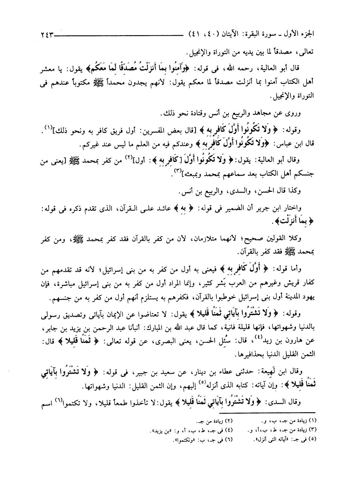 وَقَالَ أَبُو الْعَالِيَةِ: يَقُولُ: {وَلا تَكُونُوا أَوَّلَ [كَافِرٍ بِهِ} أَوَّلَ] (2) مَنْ كَفَرَ بِمُحَمَّدٍ صَلَّى اللَّهُ عَلَيْهِ وَسَلَّمَ [يَعْنِي مِنْ جِنْسِكُمْ أَهْلَ الْكِتَابِ بَعْدَ سَمَاعِهِمْ بِمُحَمَّدٍ وَبِمَبْعَثِهِ] (3) .
