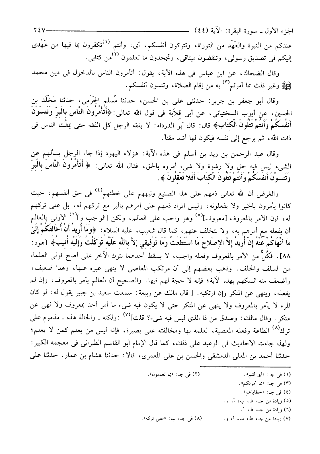 وَقَالَ الضَّحَّاكُ، عَنِ ابْنِ عَبَّاسٍ فِي هَذِهِ الْآيَةِ، يَقُولُ: أَتَأْمَرُونَ النَّاسَ بِالدُّخُولِ فِي دِينِ مُحَمَّدٍ صَلَّى اللَّهُ عَلَيْهِ وَسَلَّمَ وَغَيْرِ ذَلِكَ مِمَّا أُمِرْتُمْ (3) بِهِ مِنْ إِقَامِ الصَّلَاةِ، وَتَنْسَوْنَ أَنْفُسَكُمْ.