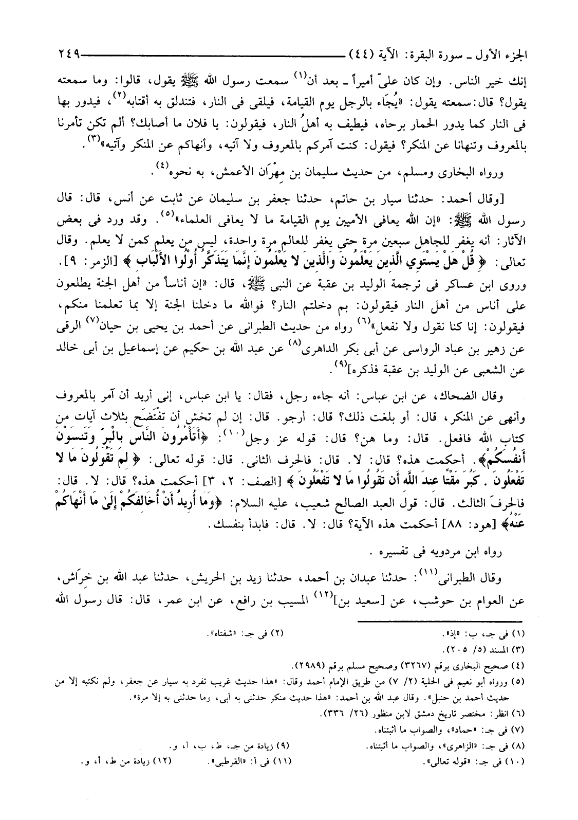 [وَقَالَ أَحْمَدُ: حَدَّثَنَا سَيَّارُ بْنُ حَاتِمٍ، حَدَّثَنَا جَعْفَرُ بْنُ سُلَيْمَانَ عَنْ ثَابِتٍ عَنْ أَنَسٍ، قَالَ: قَالَ رَسُولُ اللَّهِ صَلَّى اللَّهُ عَلَيْهِ وَسَلَّمَ: "إِنَّ اللَّهَ يُعَافِي الْأُمِّيِّينَ يَوْمَ الْقِيَامَةِ مَا لَا يُعَافِي الْعُلَمَاءَ" (5) . وَقَدْ وَرَدَ فِي بَعْضِ الْآثَارِ: أَنَّهُ يَغْفِرُ لِلْجَاهِلِ سَبْعِينَ مَرَّةً حَتَّى يَغْفِرَ لِلْعَالِمِ مَرَّةً وَاحِدَةً، لَيْسَ مَنْ يَعْلَمُ كَمَنْ لَا يَعْلَمُ. وَقَالَ تَعَالَى: {قُلْ هَلْ يَسْتَوِي الَّذِينَ يَعْلَمُونَ وَالَّذِينَ لَا يَعْلَمُونَ إِنَّمَا يَتَذَكَّرُ أُولُو الألْبَابِ} [الزُّمَرِ: 9] . وَرَوَى ابْنُ عَسَاكِرَ فِي تَرْجَمَةِ الْوَلِيدِ بْنِ عُقْبَةَ عَنِ النَّبِيِّ صَلَّى اللَّهُ عَلَيْهِ وَسَلَّمَ قَالَ: "إِنَّ أُنَاسًا مِنْ أَهْلِ الْجَنَّةِ يَطَّلِعُونَ عَلَى أُنَاسٍ مِنْ أَهْلِ النَّارِ فَيَقُولُونَ: بِمَ دَخَلْتُمُ النَّارَ؟ فَوَاللَّهِ مَا دَخَلْنَا الْجَنَّةَ إِلَّا بِمَا تَعَلَّمْنَا مِنْكُمْ، فَيَقُولُونَ: إِنَّا كُنَّا نَقُولُ وَلَا نَفْعَلُ" (6) رَوَاهُ مِنْ حَدِيثِ الطَّبَرَانِيِّ عَنْ أَحْمَدَ بْنِ يَحْيَى بْنِ حَيَّانَ (7) الرَّقِيِّ عَنْ زُهَيْرِ بْنِ عَبَّادٍ الرَّوَاسِيِّ عَنْ أَبِي بَكْرٍ الدَّاهِرِيِّ (8) عَنْ عَبْدِ اللَّهِ بْنِ حَكِيمٍ عَنْ إِسْمَاعِيلَ بْنِ أَبِي خَالِدٍ عَنِ الشَّعْبِيِّ عن الْوَلِيدِ بْنِ عُقْبَةَ فَذَكَرَهُ] (9) .