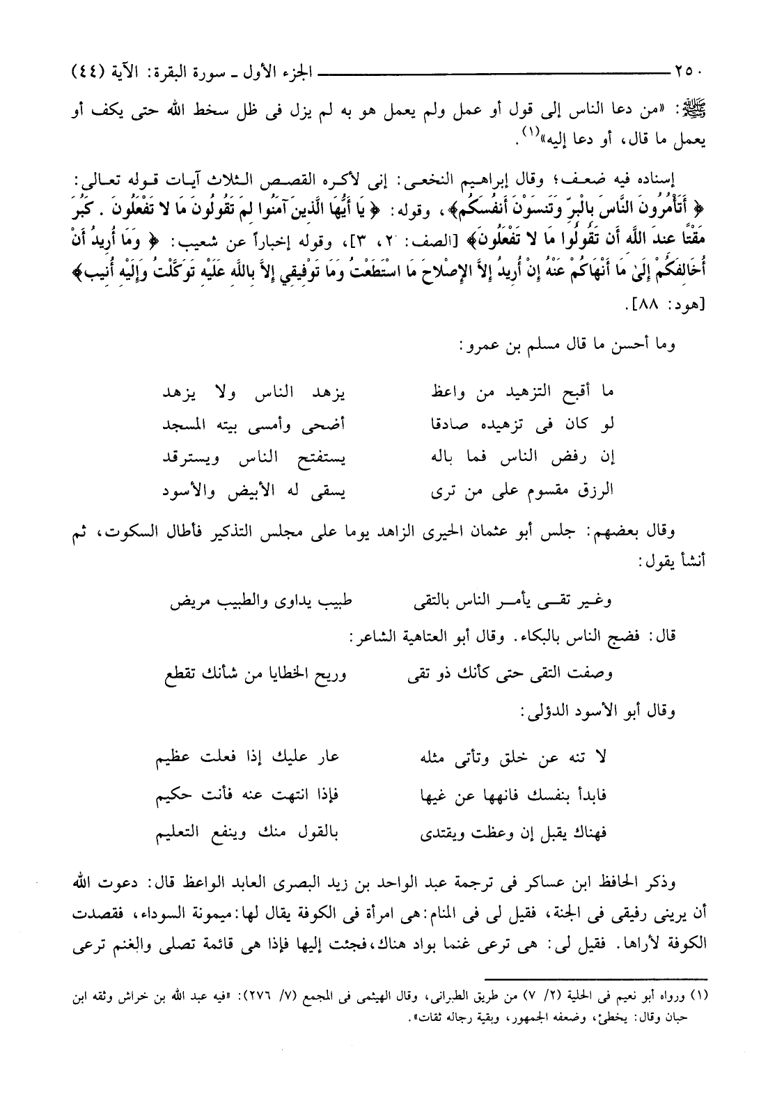 إِسْنَادُهُ فِيهِ ضَعْفٌ، وَقَالَ إِبْرَاهِيمُ النَّخَعِيُّ: إِنِّي لِأَكْرَهُ الْقَصَصَ لِثَلَاثِ آيَاتٍ قَوْلُهُ تَعَالَى: {أَتَأْمُرُونَ النَّاسَ بِالْبِرِّ وَتَنْسَوْنَ أَنْفُسَكُمْ} وَقَوْلُهُ {يَا أَيُّهَا الَّذِينَ آمَنُوا لِمَ تَقُولُونَ مَا لَا تَفْعَلُونَ * كَبُرَ مَقْتًا عِنْدَ اللَّهِ أَنْ تَقُولُوا مَا لَا تَفْعَلُونَ} [الصَّفِّ: 2، 3] وَقَوْلُهُ إِخْبَارًا عَنْ شُعَيْبٍ: {وَمَا أُرِيدُ أَنْ أُخَالِفَكُمْ إِلَى مَا أَنْهَاكُمْ عَنْهُ إِنْ أُرِيدُ إِلا الإصْلاحَ مَا اسْتَطَعْتُ وَمَا تَوْفِيقِي إِلا بِاللَّهِ عَلَيْهِ تَوَكَّلْتُ وَإِلَيْهِ أُنِيبُ} [هُودٍ: 88] .