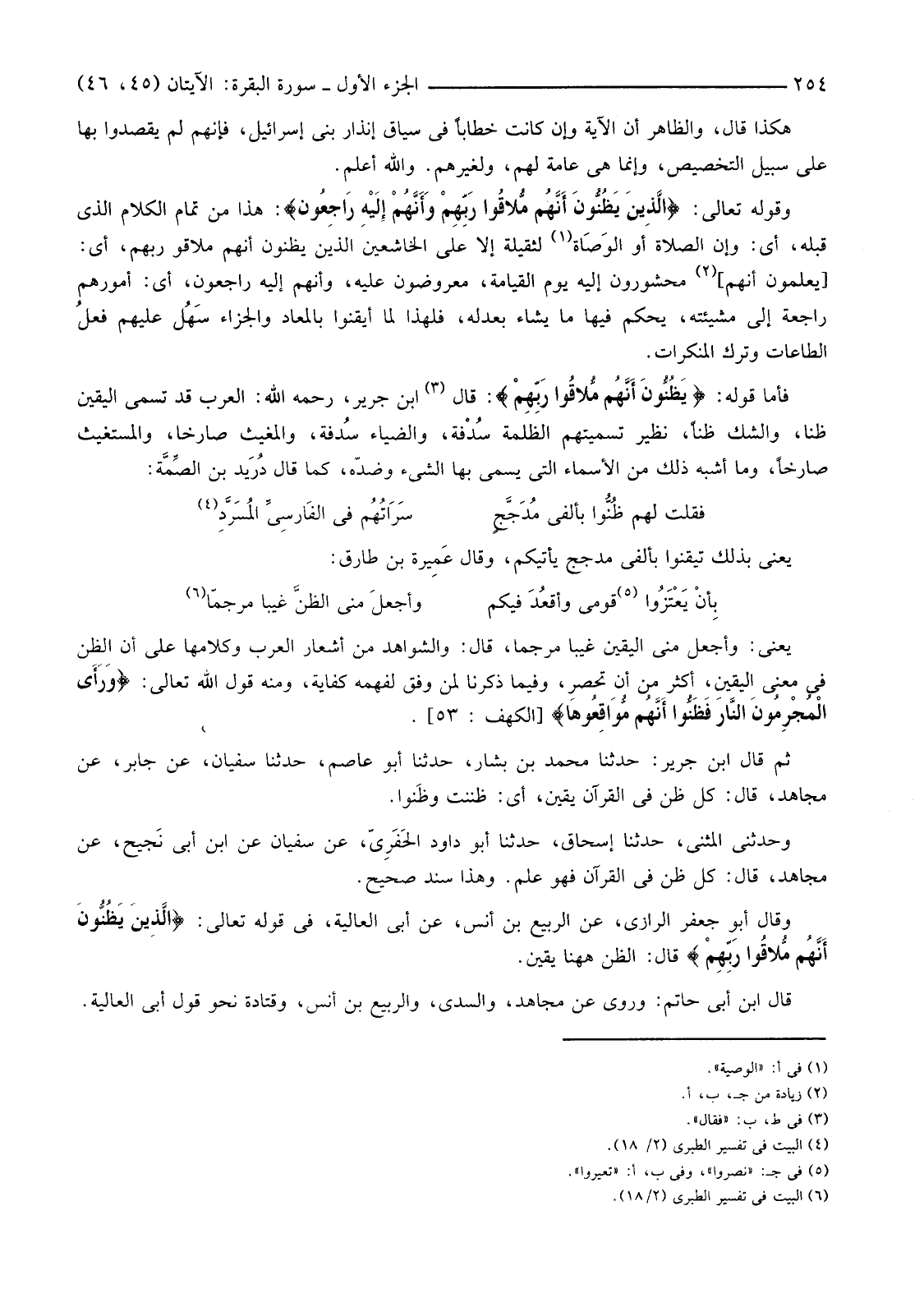 فَأَمَّا قَوْلُهُ: {يَظُنُّونَ أَنَّهُمْ مُلاقُو رَبِّهِمْ} قَالَ (3) ابْنُ جَرِيرٍ، رَحِمَهُ اللَّهُ: الْعَرَبُ قَدْ تُسَمِّي الْيَقِينَ ظَنًّا، وَالشَّكَّ ظَنًّا، نَظِيرُ تَسْمِيَتِهِمُ الظُّلْمَةَ سُدْفة، وَالضِّيَاءَ سُدفة، وَالْمُغِيثَ صَارِخًا، وَالْمُسْتَغِيثَ صَارِخًا، وَمَا أَشْبَهَ ذَلِكَ مِنَ الْأَسْمَاءِ الَّتِي يُسَمَّى بِهَا الشَّيْءُ وَضِدُّهُ، كَمَا قَالَ دُرَيد بْنُ الصِّمَّة: