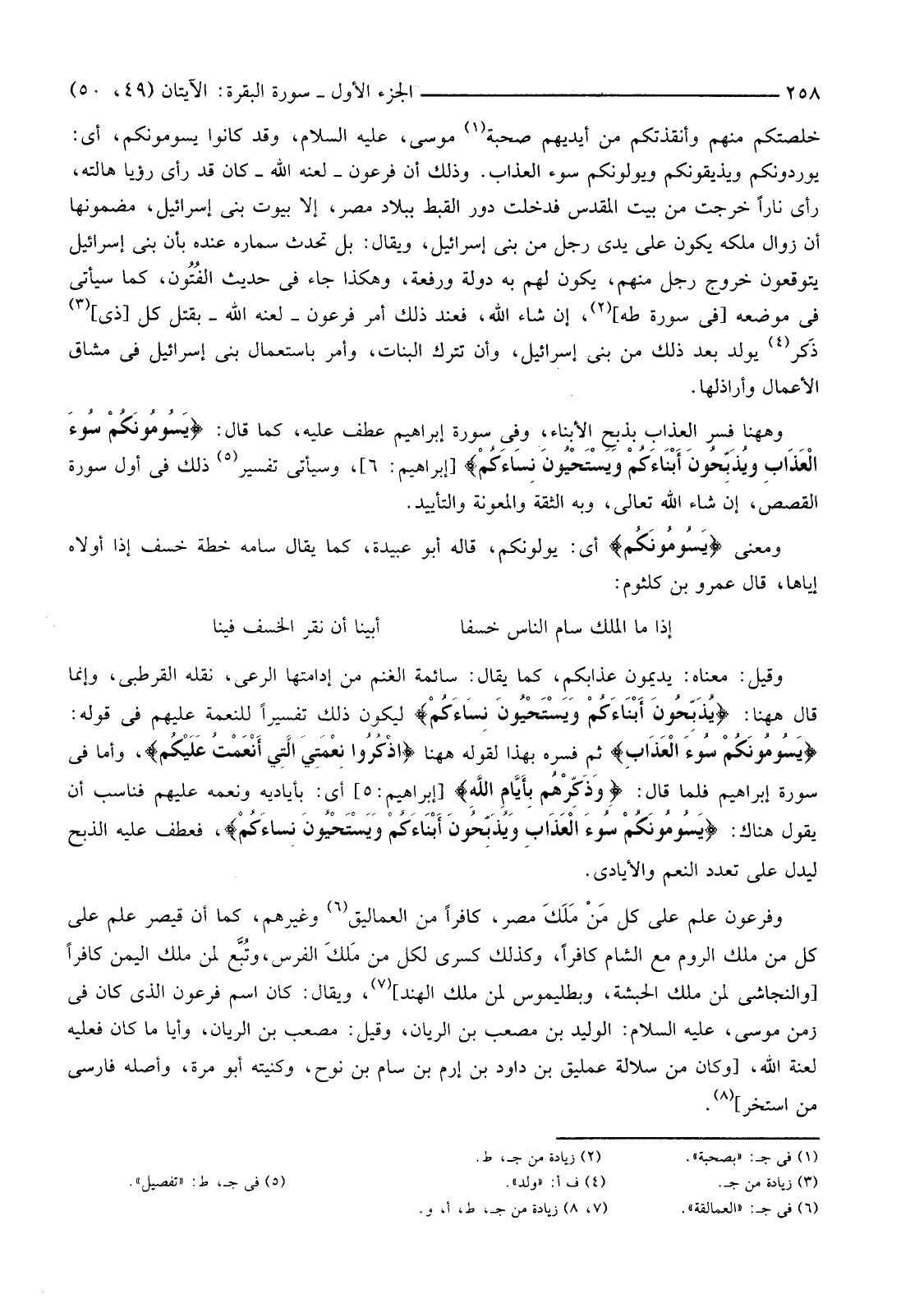 وَهَاهُنَا فُسِّرَ الْعَذَابُ بِذَبْحِ الْأَبْنَاءِ، وَفِي سُورَةِ إِبْرَاهِيمَ عَطْفٌ عَلَيْهِ، كَمَا قَالَ: {يَسُومُونَكُمْ سُوءَ الْعَذَابِ ويُذَبِّحُونَ أَبْنَاءَكُمْ وَيَسْتَحْيُونَ نِسَاءَكُمْ} [إِبْرَاهِيمَ] وَسَيَأْتِي تَفْسِيرُ (4) ذَلِكَ فِي أَوَّلِ سُورَةِ الْقَصَصِ، إِنْ شَاءَ اللَّهُ تَعَالَى، وَبِهِ الثِّقَةُ وَالْمَعُونَةُ وَالتَّأْيِيدُ.