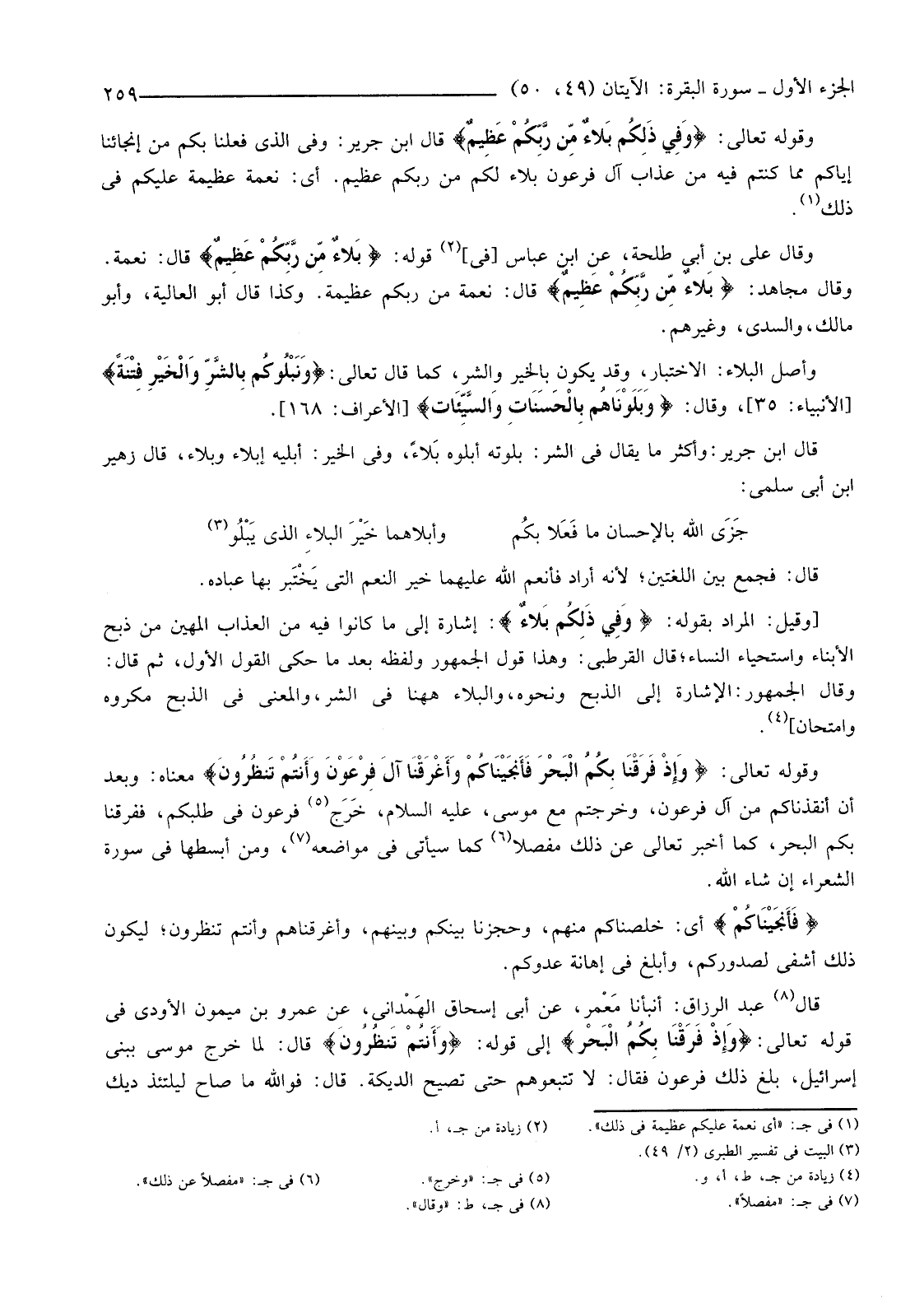 وَقَوْلُهُ تَعَالَى: {وَفِي ذَلِكُمْ بَلاءٌ مِنْ رَبِّكُمْ عَظِيمٌ} قَالَ ابْنُ جَرِيرٍ: وَفِي الَّذِي فَعَلْنَا بِكُمْ مِنْ إِنْجَائِنَا إِيَّاكُمْ مِمَّا كُنْتُمْ فِيهِ مِنْ عَذَابِ آلِ فِرْعَوْنَ بَلَاءٌ لَكُمْ مِنْ رَبِّكُمْ عَظِيمٌ. أَيْ: نِعْمَةٌ عَظِيمَةٌ عَلَيْكُمْ فِي ذَلِكَ (1) .