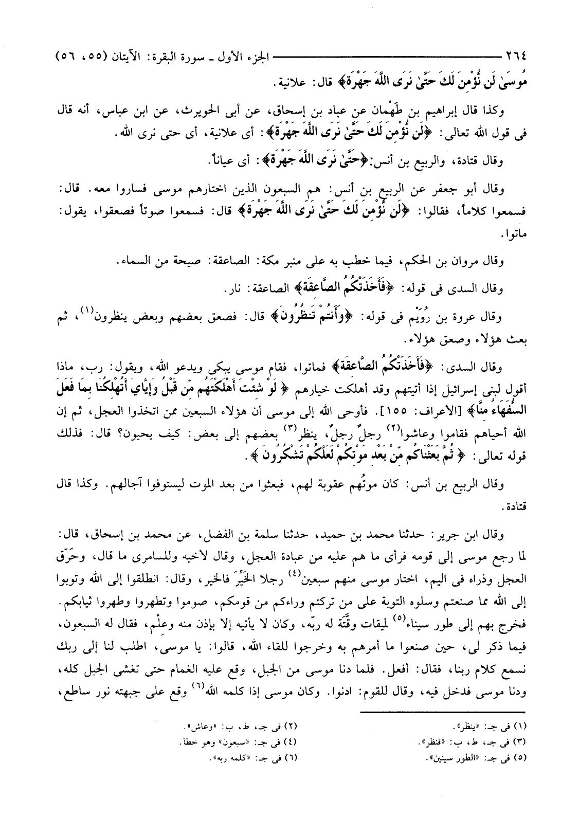 وَقَالَ أَبُو جَعْفَرٍ عَنِ الرَّبِيعِ بْنِ أَنَسٍ: هُمُ السَّبْعُونَ الَّذِينَ اخْتَارَهُمْ مُوسَى فَسَارُوا مَعَهُ. قَالَ: فَسَمِعُوا كَلَامًا، فَقَالُوا: {لَنْ نُؤْمِنَ لَكَ حَتَّى نَرَى اللَّهَ جَهْرَةً} قَالَ: فَسَمِعُوا صَوْتًا فَصُعِقُوا، يَقُولُ: مَاتُوا.