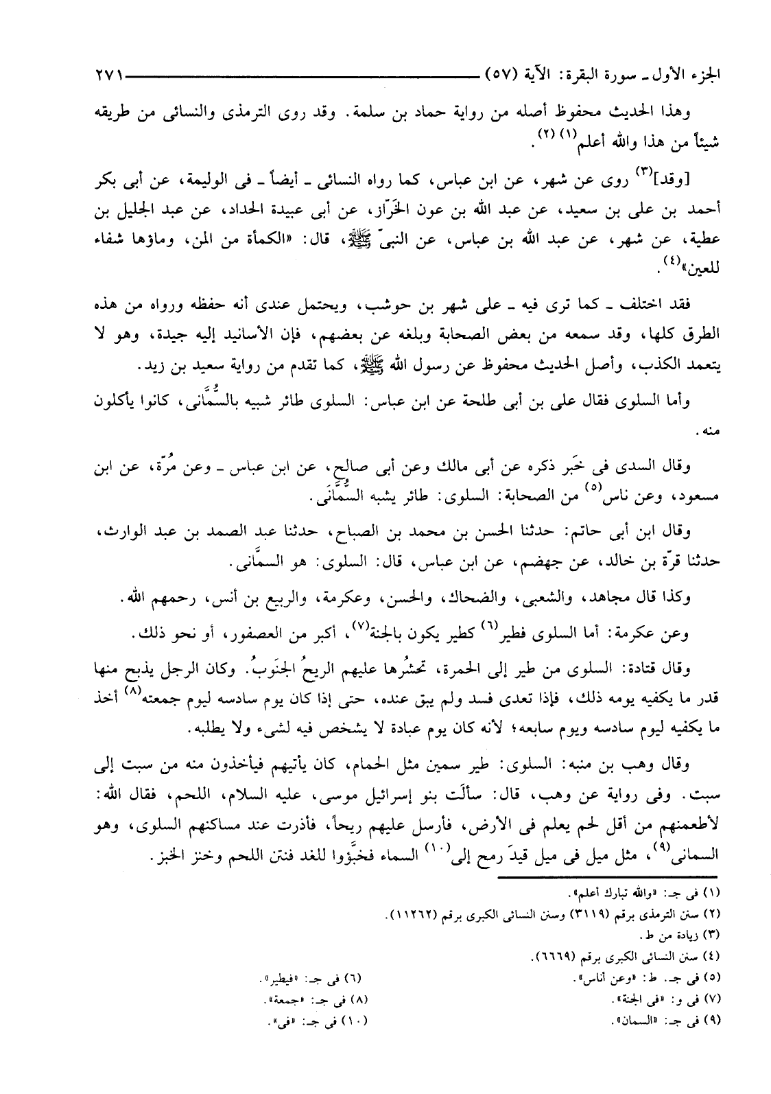 وَأَمَّا السَّلْوَى فَقَالَ عَلِيُّ بْنُ أَبِي طَلْحَةَ عَنِ ابْنِ عَبَّاسٍ: السَّلْوَى طَائِرٌ شَبِيهٌ بالسُّمَّانى، كَانُوا يَأْكُلُونَ مِنْهُ.