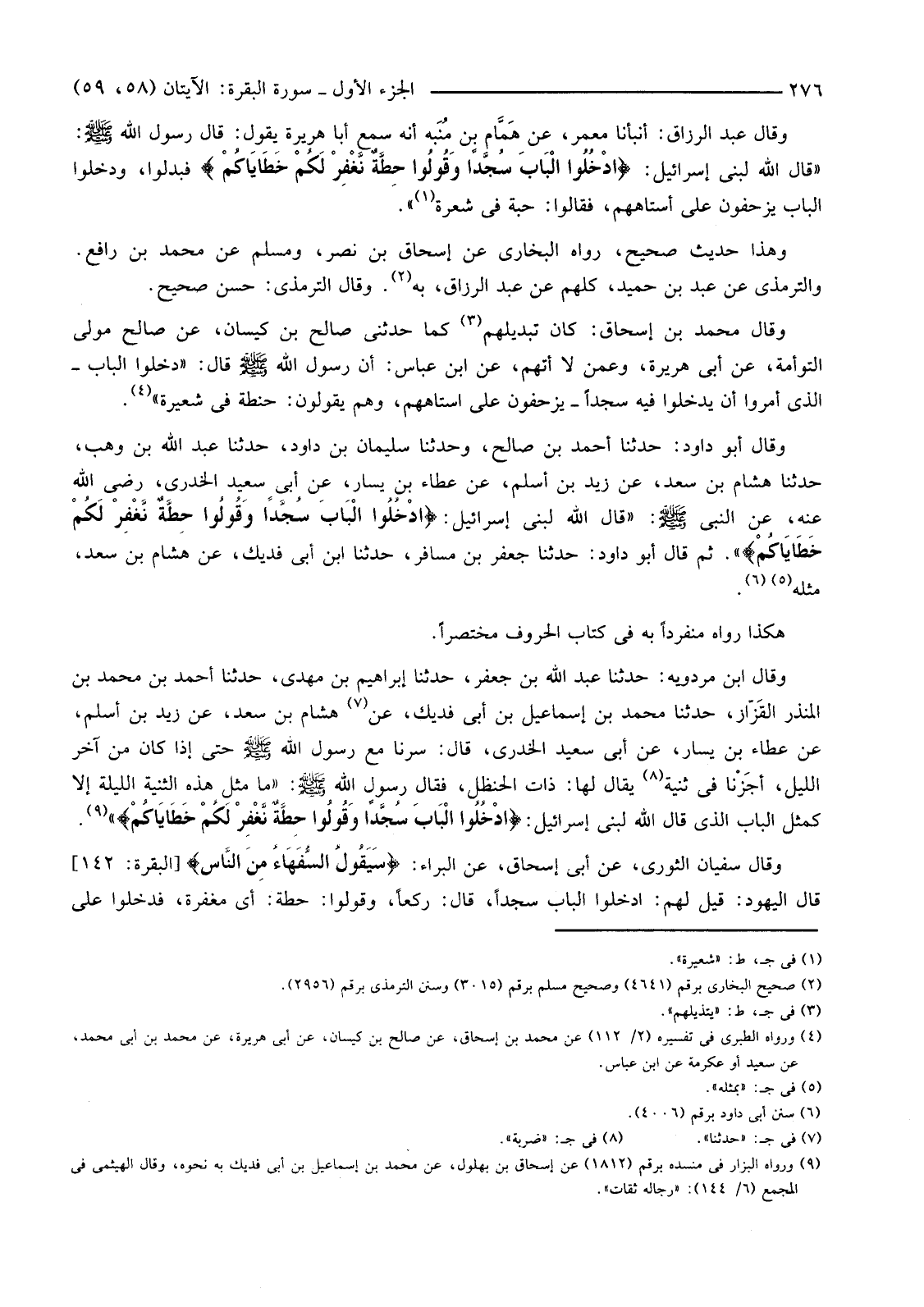 وَقَالَ سُفْيَانُ الثَّوْرِيُّ، عَنْ أَبِي إِسْحَاقَ، عَنِ الْبَرَاءِ: {سَيَقُولُ السُّفَهَاءُ مِنَ النَّاسِ} [الْبَقَرَةِ: 142] قَالَ الْيَهُودُ: قِيلَ لَهُمُ: ادْخُلُوا الْبَابَ سُجَّدًا، قَالَ: رُكَّعًا، وَقُولُوا: حِطَّةٌ: أَيْ مَغْفِرَةٌ، فدخلوا على