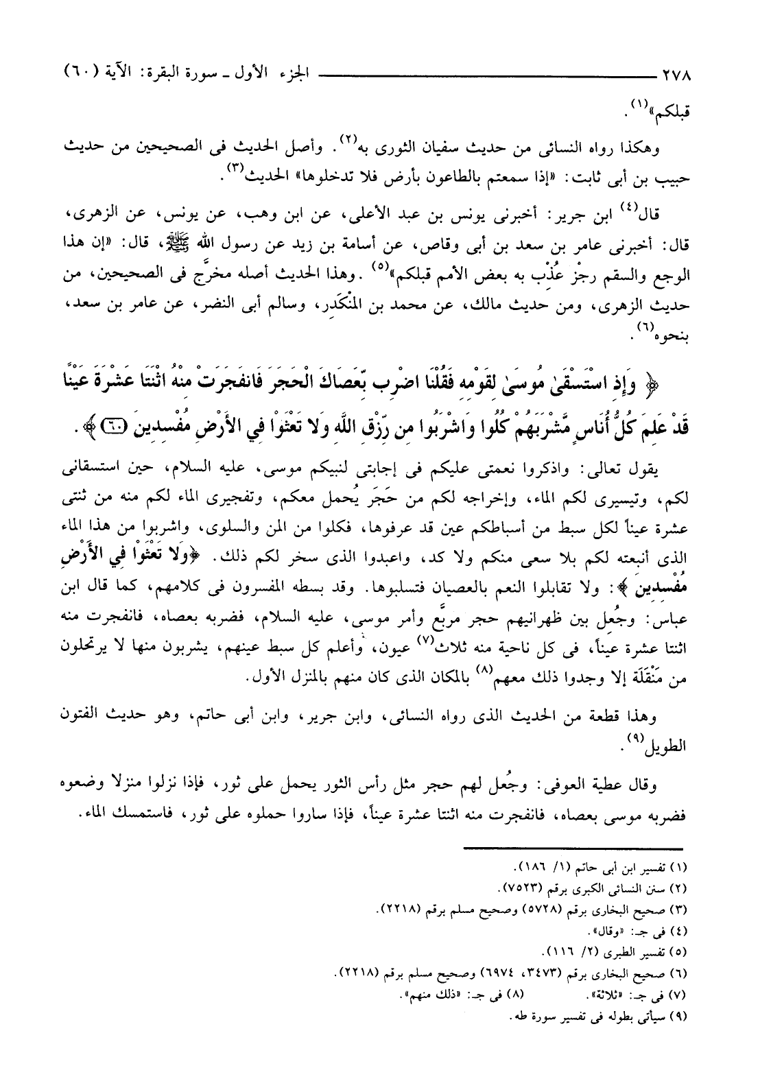 {وَإِذِ اسْتَسْقَى مُوسَى لِقَوْمِهِ فَقُلْنَا اضْرِبْ بِعَصَاكَ الْحَجَرَ فَانْفَجَرَتْ مِنْهُ اثْنَتَا عَشْرَةَ عَيْنًا قَدْ عَلِمَ كُلُّ أُنَاسٍ مَشْرَبَهُمْ كُلُوا وَاشْرَبُوا مِنْ رِزْقِ اللَّهِ وَلا تَعْثَوْا فِي الأرْضِ مُفْسِدِينَ (60) }