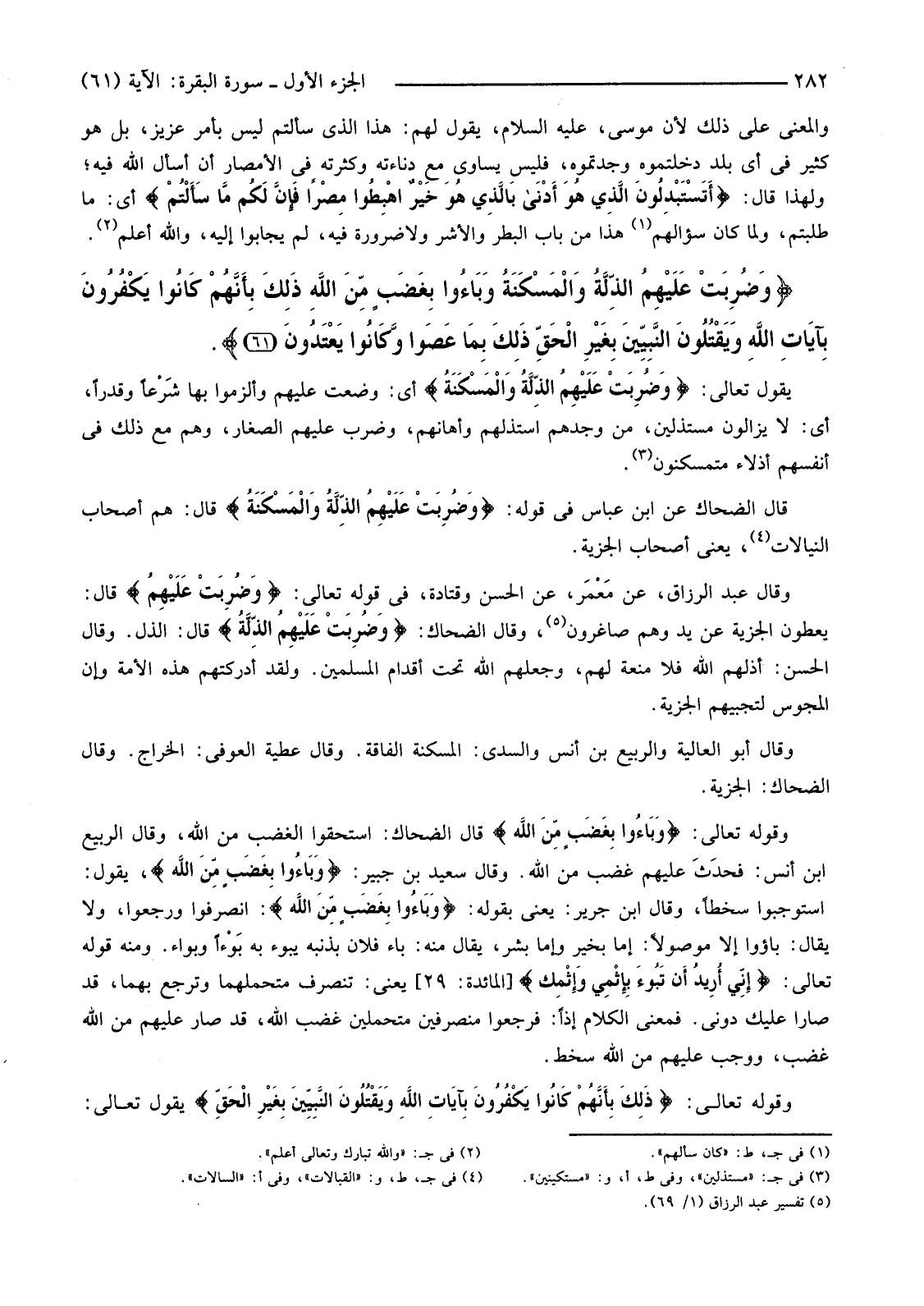 وَقَالَ عَبْدُ الرَّزَّاقِ، عَنْ مَعْمَر، عَنِ الْحَسَنِ وَقَتَادَةَ، فِي قَوْلِهِ تَعَالَى: {وَضُرِبَتْ عَلَيْهِمُ} قَالَ: يُعْطُونَ الْجِزْيَةَ عَنْ يَدٍ وَهُمْ صَاغِرُونَ (4) ، وَقَالَ الضَّحَّاكُ: {وَضُرِبَتْ عَلَيْهِمُ الذِّلَّةُ} قَالَ: الذُّلُّ. وَقَالَ الْحَسَنُ: أَذَلَّهُمُ اللَّهُ فَلَا مَنَعَةَ لَهُمْ، وَجَعَلَهُمُ اللَّهُ تَحْتَ أَقْدَامِ الْمُسْلِمِينَ. وَلَقَدْ أَدْرَكَتْهُمْ هَذِهِ الْأُمَّةُ وَإِنَّ الْمَجُوسَ لَتَجْبِيهِمُ الْجِزْيَةَ.