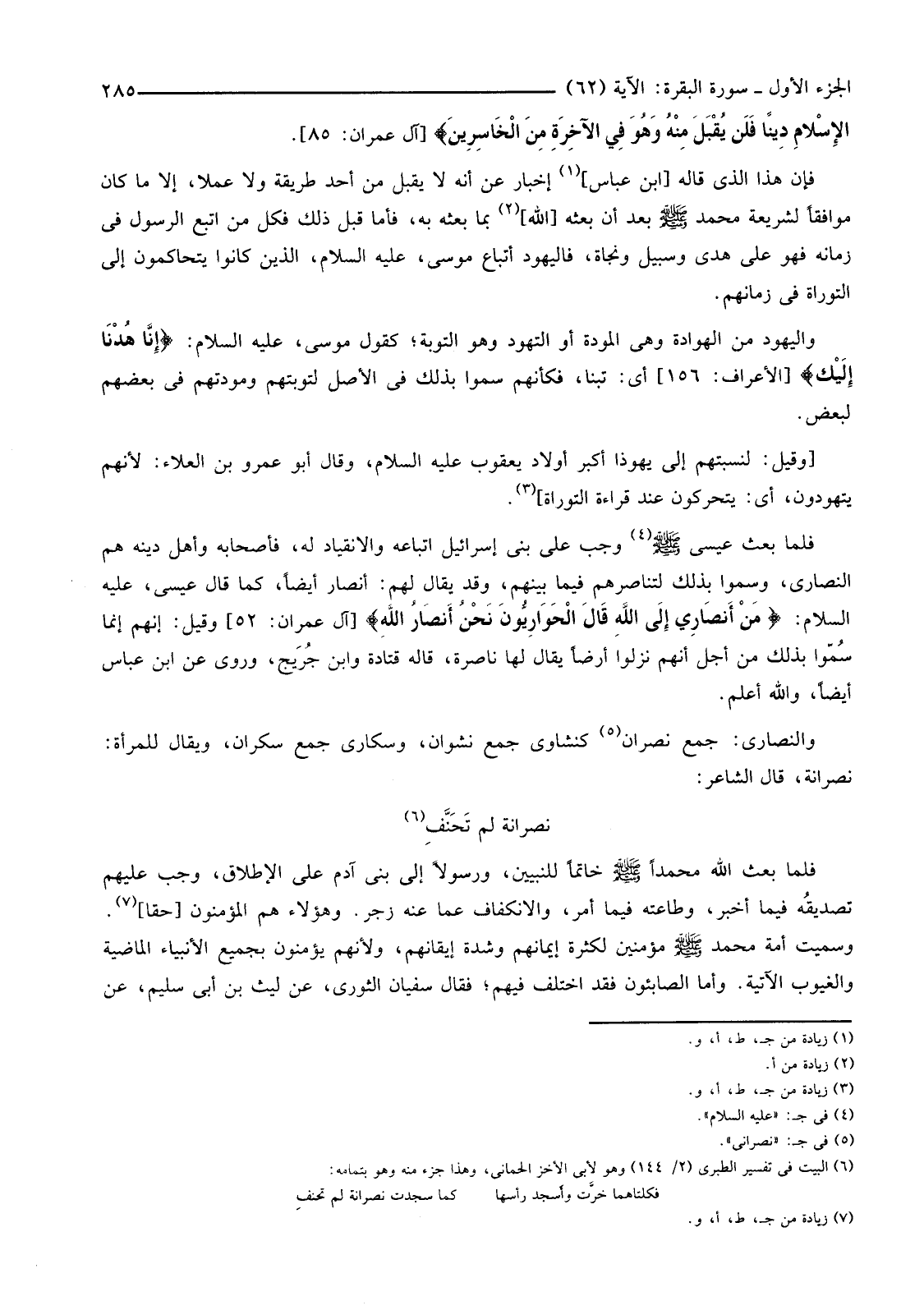 فَلَمَّا بَعَثَ اللَّهُ مُحَمَّدًا صَلَّى اللَّهُ عَلَيْهِ وَسَلَّمَ خَاتَمًا لِلنَّبِيِّينَ، وَرَسُولًا إِلَى بَنِي آدَمَ عَلَى الْإِطْلَاقِ، وَجَبَ عَلَيْهِمْ تصديقُه فِيمَا أَخْبَرَ، وَطَاعَتُهُ فِيمَا أَمَرَ، وَالِانْكِفَافُ عَمَّا عَنْهُ زَجَرَ. وَهَؤُلَاءِ هُمُ الْمُؤْمِنُونَ [حَقًّا] (7) . وَسُمِّيَتْ أُمَّةُ مُحَمَّدٍ صَلَّى اللَّهُ عَلَيْهِ وَسَلَّمَ مُؤْمِنِينَ لِكَثْرَةِ إِيمَانِهِمْ وَشِدَّةِ إِيقَانِهِمْ، وَلِأَنَّهُمْ يُؤْمِنُونَ بِجَمِيعِ الْأَنْبِيَاءِ الْمَاضِيَةِ وَالْغُيُوبِ الْآتِيَةِ. وَأَمَّا الصَّابِئُونَ فَقَدِ اخْتُلِفَ فِيهِمْ؛ فَقَالَ سفيان الثَّوْرِيُّ، عَنْ لَيْثِ بْنِ أَبِي سُلَيْمٍ، عَنْ