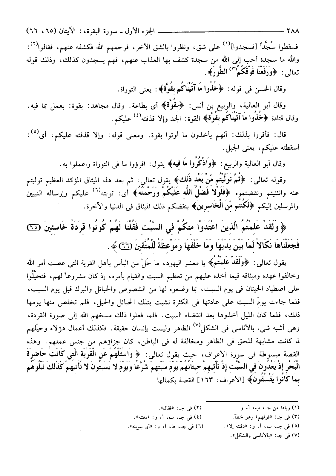 {وَلَقَدْ عَلِمْتُمُ الَّذِينَ اعْتَدَوْا مِنْكُمْ فِي السَّبْتِ فَقُلْنَا لَهُمْ كُونُوا قِرَدَةً خَاسِئِينَ (65) فَجَعَلْنَاهَا نَكَالا لِمَا بَيْنَ يَدَيْهَا وَمَا خَلْفَهَا وَمَوْعِظَةً لِلْمُتَّقِينَ (66) }