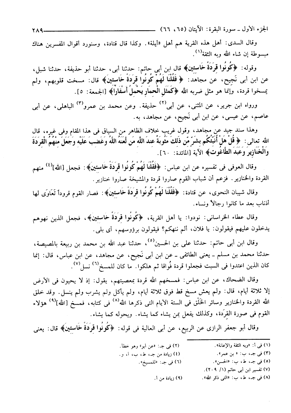 وَقَوْلُهُ: {كُونُوا قِرَدَةً خَاسِئِينَ} قَالَ ابْنُ أَبِي حَاتِمٍ: حَدَّثَنَا أَبِي، حَدَّثَنَا أَبُو حُذَيْفَةَ، حَدَّثَنَا شِبْلٌ، عَنِ ابْنِ أَبِي نجيح، عن مجاهد: {فَقُلْنَا لَهُمْ كُونُوا قِرَدَةً خَاسِئِينَ} قَالَ: مُسِخَتْ قُلُوبُهُمْ، وَلَمْ يُمْسَخُوا قِرَدَةً، وَإِنَّمَا هُوَ مَثَلٌ ضَرَبَهُ اللَّهُ {كَمَثَلِ الْحِمَارِ يَحْمِلُ أَسْفَارًا} [الْجُمُعَةِ: 5] .