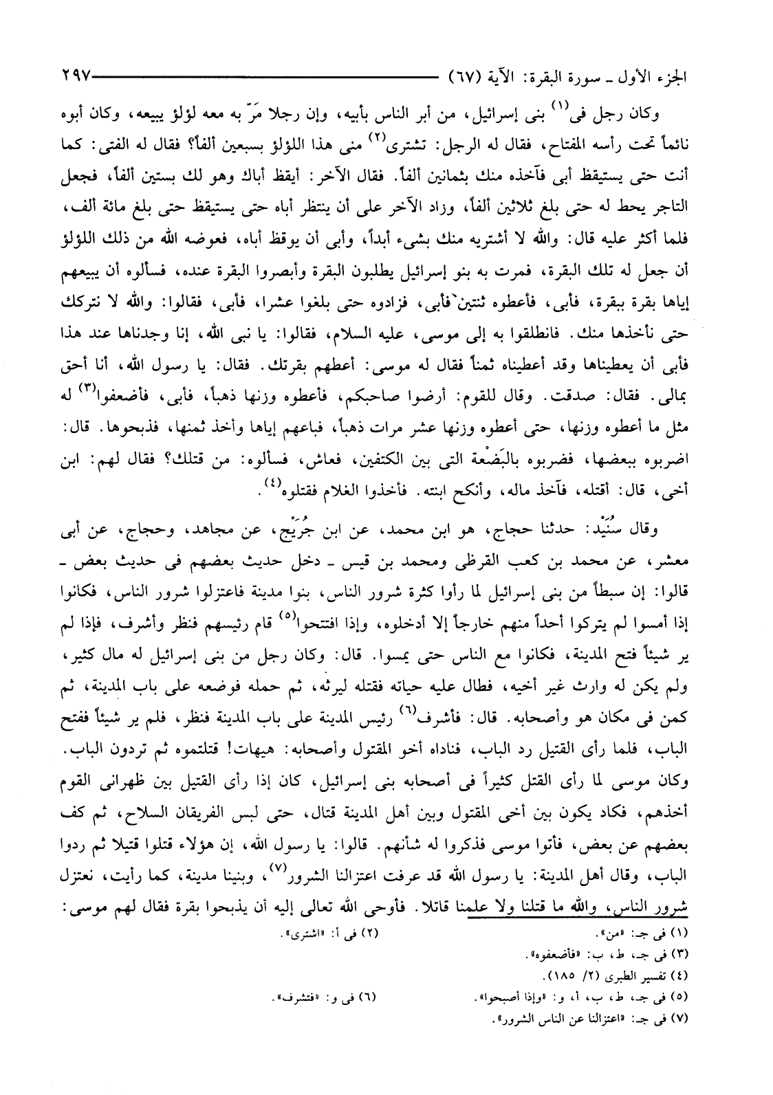 وَقَالَ سُنَيْدٌ: حَدَّثَنَا حَجَّاجٌ، هُوَ ابْنُ مُحَمَّدٍ، عَنِ ابْنِ جُرَيْجٍ، عَنْ مُجَاهِدٍ، وَحَجَّاجٍ، عَنْ أَبِي مَعْشَرٍ، عَنْ مُحَمَّدِ بْنِ كَعْبٍ الْقُرَظِيِّ وَمُحَمَّدِ بْنِ قَيْسٍ -دَخَلَ حَدِيثُ بَعْضِهِمْ فِي حَدِيثِ بَعْضٍ-قَالُوا: إِنَّ سِبْطًا مِنْ بَنِي إِسْرَائِيلَ لَمَّا رَأَوْا كَثْرَةَ شُرُورِ النَّاسِ، بَنَوْا مَدِينَةً فَاعْتَزَلُوا شُرُورَ النَّاسِ، فَكَانُوا إِذَا أَمْسَوْا لَمْ يَتْرُكُوا أَحَدًا مِنْهُمْ خَارِجًا إِلَّا أَدْخَلُوهُ، وَإِذَا افْتَتَحُوا (5) قَامَ رَئِيسُهُمْ فَنَظَرَ وَأَشْرَفَ، فَإِذَا لَمْ يَرَ شَيْئًا فَتَحَ الْمَدِينَةَ، فَكَانُوا مَعَ النَّاسِ حَتَّى يُمْسُوا. قَالَ: وَكَانَ رَجُلٌ مِنْ بَنِي إِسْرَائِيلَ لَهُ مَالٌ كَثِيرٌ، وَلَمْ يَكُنْ لَهُ وَارِثٌ غَيْرُ أَخِيهِ، فَطَالَ عَلَيْهِ حَيَاتَهُ فَقَتَلَهُ لِيَرِثَهُ، ثُمَّ حَمَلَهُ فَوَضَعَهُ عَلَى بَابِ الْمَدِينَةِ، ثُمَّ كَمَنَ فِي مَكَانٍ هُوَ وَأَصْحَابُهُ. قَالَ: فَأَشْرَفَ (6) رَئِيسُ الْمَدِينَةِ عَلَى بَابِ الْمَدِينَةِ فَنَظَرَ، فَلَمْ يَرَ شَيْئًا فَفَتَحَ الْبَابَ، فَلَمَّا رَأَى الْقَتِيلَ رَدَّ الْبَابَ، فَنَادَاهُ أَخُو الْمَقْتُولِ وَأَصْحَابُهُ: هَيْهَاتَ! قَتَلْتُمُوهُ ثُمَّ تَرُدُّونَ الْبَابَ. وَكَانَ مُوسَى لَمَّا رَأَى الْقَتْلَ كَثِيرًا فِي أَصْحَابِهِ بَنِي إِسْرَائِيلَ، كَانَ إِذَا رَأَى الْقَتِيلَ بَيْنَ ظَهْرَانَيِ الْقَوْمِ أَخَذَهُمْ، فَكَادَ يَكُونُ بَيْنِ أَخِي الْمَقْتُولِ وَبَيْنَ أَهْلِ الْمَدِينَةِ قِتَالٌ، حَتَّى لَبِسَ الْفَرِيقَانِ السِّلَاحَ، ثُمَّ كَفَّ بَعْضُهُمْ عَنْ بَعْضٍ، فَأَتَوْا مُوسَى فَذَكَرُوا لَهُ شَأْنَهُمْ. قَالُوا: يَا رَسُولَ اللَّهِ، إِنَّ هَؤُلَاءِ قَتَلُوا قَتِيلًا ثُمَّ رَدُّوا الْبَابَ، وَقَالَ أَهْلُ الْمَدِينَةِ: يَا رَسُولَ اللَّهِ قَدْ عَرَفْتَ اعْتِزَالَنَا الشُّرُورَ (7) وَبَنَيْنَا مَدِينَةً، كَمَا رَأَيْتَ، نَعْتَزِلُ شُرُورَ النَّاسِ، وَاللَّهِ مَا قَتَلْنَا وَلَا عَلِمْنَا قَاتِلًا. فَأَوْحَى اللَّهُ تَعَالَى إِلَيْهِ أَنْ يَذْبَحُوا بَقَرَةً فَقَالَ لَهُمْ مُوسَى: