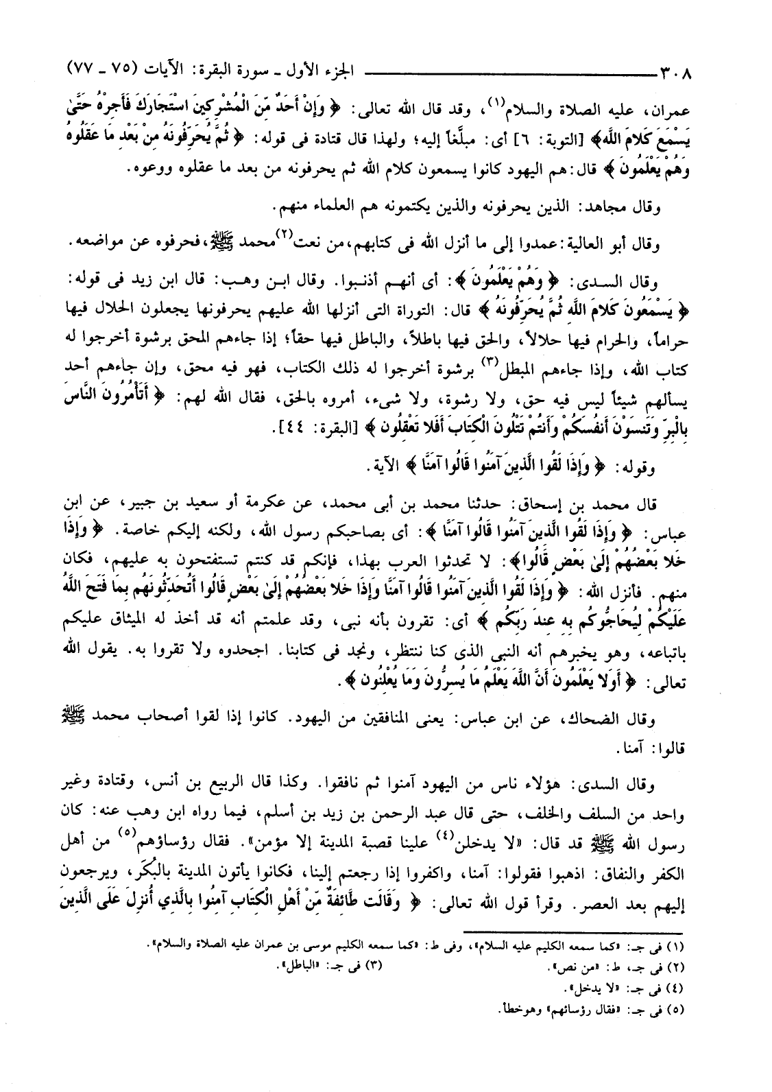 عِمْرَانَ، عَلَيْهِ الصَّلَاةُ وَالسَّلَامُ (1) ، وَقَدْ قَالَ اللَّهُ تَعَالَى: {وَإِنْ أَحَدٌ مِنَ الْمُشْرِكِينَ اسْتَجَارَكَ فَأَجِرْهُ حَتَّى يَسْمَعَ كَلامَ اللَّهِ} [التَّوْبَةِ: 6] ، أَيْ: مبلَّغًا إِلَيْهِ؛ وَلِهَذَا قَالَ قَتَادَةُ فِي قَوْلِهِ: {ثُمَّ يُحَرِّفُونَهُ مِنْ بَعْدِ مَا عَقَلُوهُ وَهُمْ يَعْلَمُونَ} قَالَ: هُمُ الْيَهُودُ كَانُوا يَسْمَعُونَ كَلَامَ اللَّهِ ثُمَّ يُحَرِّفُونَهُ مِنْ بَعْدِ مَا عَقَلُوهُ وَوَعَوْهُ.
