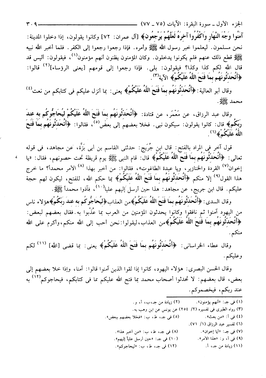 وَقَالَ عَبْدُ الرَّزَّاقِ، عَنْ مَعْمَر، عَنْ قَتَادَةَ: {أَتُحَدِّثُونَهُمْ بِمَا فَتَحَ اللَّهُ عَلَيْكُمْ لِيُحَاجُّوكُمْ بِهِ عِنْدَ رَبِّكُمْ} قَالَ: كَانُوا يَقُولُونَ: سَيَكُونُ نَبِيٌّ. فَخَلَا بَعْضُهُمْ بِبَعْضٍ (5) فَقَالُوا: {أَتُحَدِّثُونَهُمْ بِمَا فَتَحَ اللَّهُ عَلَيْكُمْ} (6) .