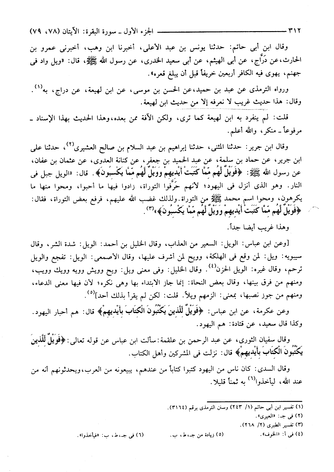 وَقَالَ ابْنُ جَرِيرٍ: حَدَّثَنَا الْمُثَنَّى، حَدَّثَنَا إِبْرَاهِيمُ بْنُ عَبْدِ السَّلَامِ بْنِ صَالِحٍ الْعَشِيرِيُّ (2) حَدَّثَنَا عَلِيُّ بْنُ جَرِيرٍ، عَنْ حَمَّادِ بْنِ سَلَمَةَ، عَنْ عَبْدِ الْحَمِيدِ بْنِ جَعْفَرٍ، عَنْ كِنَانَةَ الْعَدَوِّيِّ، عَنْ عُثْمَانَ بْنِ عَفَّانَ، عَنْ رَسُولِ اللَّهِ صَلَّى اللَّهُ عَلَيْهِ وَسَلَّمَ: {فَوَيْلٌ لَهُمْ مِمَّا كَتَبَتْ أَيْدِيهِمْ وَوَيْلٌ لَهُمْ مِمَّا يَكْسِبُونَ} قَالَ: "الْوَيْلُ جَبَلٌ فِي النَّارِ. وَهُوَ الذِي أُنْزِلَ فِي الْيَهُودِ؛ لِأَنَّهُمْ حَرَّفوا التَّوْرَاةَ، زَادُوا فِيهَا مَا أَحَبُّوا، وَمَحَوْا مِنْهَا مَا يَكْرَهُونَ، وَمَحَوُا اسْمَ مُحَمَّدٍ صَلَّى اللَّهُ عَلَيْهِ وَسَلَّمَ مِنَ التَّوْرَاةِ. وَلِذَلِكَ غَضِبَ اللَّهُ عَلَيْهِمْ، فَرَفَعَ بَعْضَ التَّوْرَاةِ، فَقَالَ: {فَوَيْلٌ لَهُمْ مِمَّا كَتَبَتْ أَيْدِيهِمْ وَوَيْلٌ لَهُمْ مِمَّا يَكْسِبُونَ} (3) .