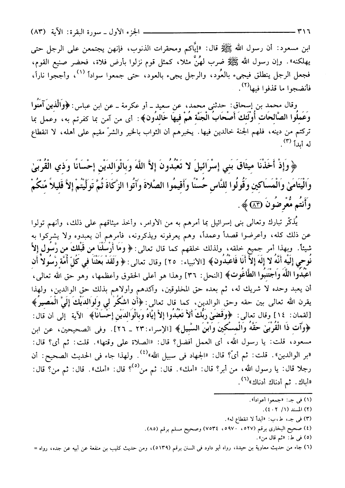 {وَإِذْ أَخَذْنَا مِيثَاقَ بَنِي إِسْرَائِيلَ لَا تَعْبُدُونَ إِلا اللَّهَ وَبِالْوَالِدَيْنِ إِحْسَانًا وَذِي الْقُرْبَى وَالْيَتَامَى وَالْمَسَاكِينِ وَقُولُوا لِلنَّاسِ حُسْنًا وَأَقِيمُوا الصَّلاةَ وَآتُوا الزَّكَاةَ ثُمَّ تَوَلَّيْتُمْ إِلا قَلِيلا مِنْكُمْ وَأَنْتُمْ مُعْرِضُونَ (83) }