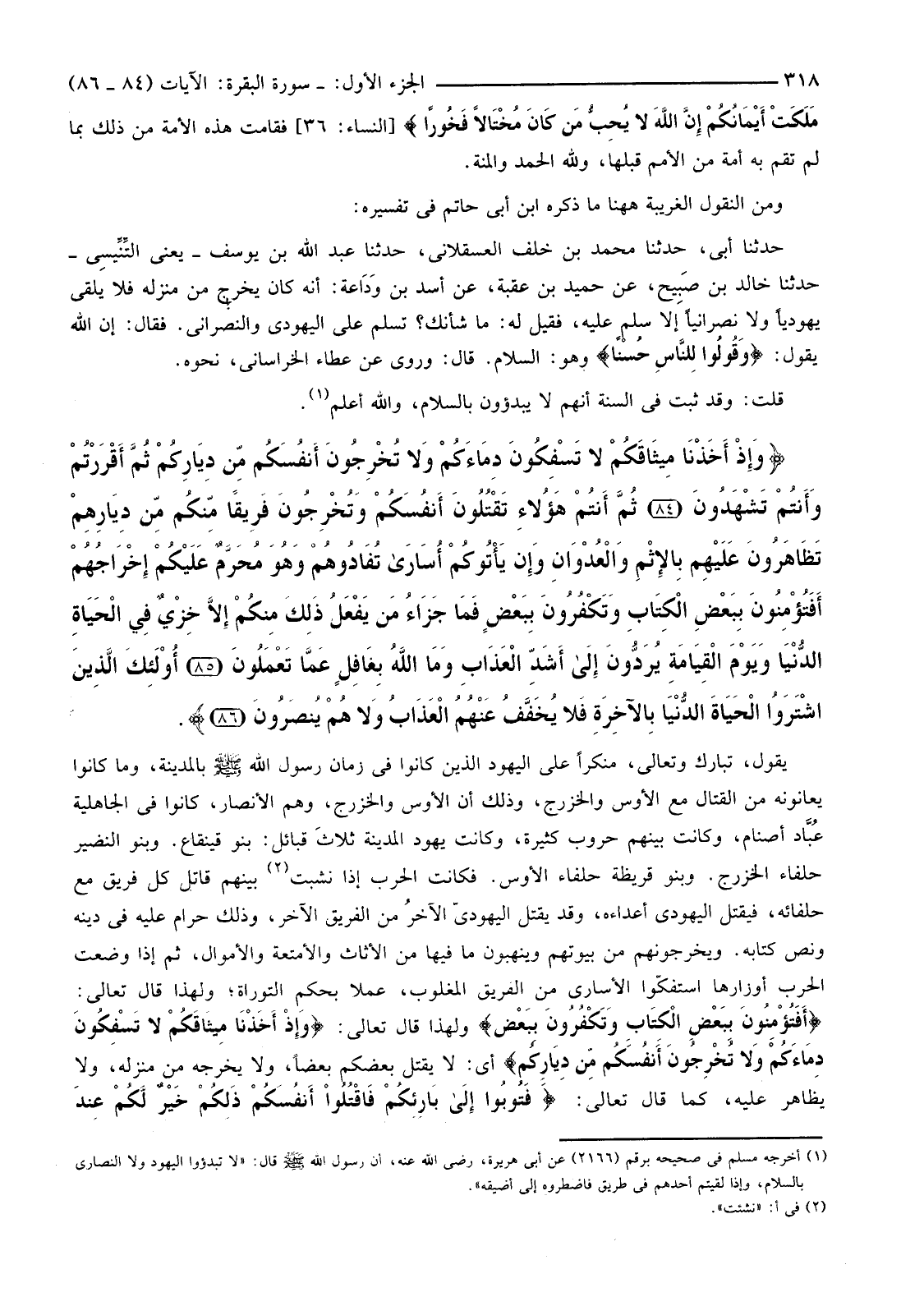 {وَإِذْ أَخَذْنَا مِيثَاقَكُمْ لَا تَسْفِكُونَ دِمَاءَكُمْ وَلا تُخْرِجُونَ أَنْفُسَكُمْ مِنْ دِيَارِكُمْ ثُمَّ أَقْرَرْتُمْ وَأَنْتُمْ تَشْهَدُونَ (84) ثُمَّ أَنْتُمْ هَؤُلاءِ تَقْتُلُونَ أَنْفُسَكُمْ وَتُخْرِجُونَ فَرِيقًا مِنْكُمْ مِنْ دِيَارِهِمْ تَظَاهَرُونَ عَلَيْهِمْ بِالإثْمِ وَالْعُدْوَانِ وَإِنْ يَأْتُوكُمْ أُسَارَى تُفَادُوهُمْ وَهُوَ مُحَرَّمٌ عَلَيْكُمْ إِخْرَاجُهُمْ أَفَتُؤْمِنُونَ بِبَعْضِ الْكِتَابِ وَتَكْفُرُونَ بِبَعْضٍ فَمَا جَزَاءُ مَنْ يَفْعَلُ ذَلِكَ مِنْكُمْ إِلا خِزْيٌ فِي الْحَيَاةِ الدُّنْيَا وَيَوْمَ الْقِيَامَةِ يُرَدُّونَ إِلَى أَشَدِّ الْعَذَابِ وَمَا اللَّهُ بِغَافِلٍ عَمَّا تَعْمَلُونَ (85) أُولَئِكَ الَّذِينَ اشْتَرَوُا الْحَيَاةَ الدُّنْيَا بِالآخِرَةِ فَلا يُخَفَّفُ عَنْهُمُ الْعَذَابُ وَلا هُمْ يُنْصَرُونَ (86) }