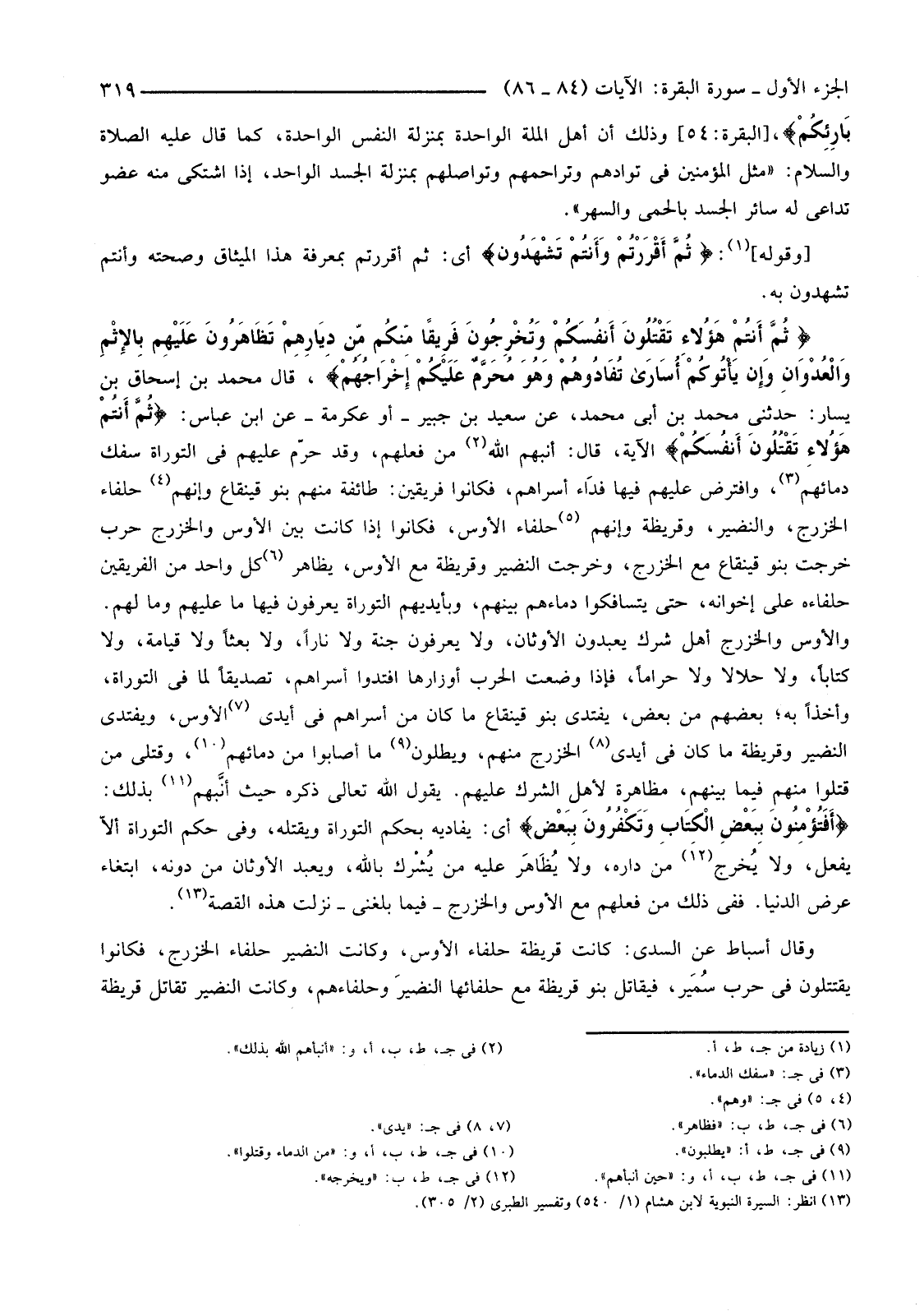 {ثُمَّ أَنْتُمْ هَؤُلاءِ تَقْتُلُونَ أَنْفُسَكُمْ وَتُخْرِجُونَ فَرِيقًا مِنْكُمْ مِنْ دِيَارِهِمْ تَظَاهَرُونَ عَلَيْهِمْ بِالإثْمِ وَالْعُدْوَانِ وَإِنْ يَأْتُوكُمْ أُسَارَى تُفَادُوهُمْ وَهُوَ مُحَرَّمٌ عَلَيْكُمْ إِخْرَاجُهُمْ} قَالَ مُحَمَّدُ بْنُ إِسْحَاقَ بْنِ يَسَارٍ: حَدَّثَنِي مُحَمَّدُ بْنُ أَبِي مُحَمَّدٍ، عَنْ سَعِيدِ بْنِ جُبَيْرٍ -أَوْ عِكْرِمَةَ-عَنِ ابْنِ عَبَّاسٍ: {ثُمَّ أَنْتُمْ هَؤُلاءِ تَقْتُلُونَ أَنْفُسَكُمْ} الْآيَةَ، قَالَ: أَنَّبَهُمُ اللَّهُ (2) مِنْ فِعْلِهِمْ، وَقَدْ حَرَّمَ عَلَيْهِمْ فِي التَّوْرَاةِ سَفْكَ دِمَائِهِمْ (3) وَافْتَرَضَ عَلَيْهِمْ فِيهَا فدَاء أَسْرَاهُمْ، فَكَانُوا فَرِيقَيْنِ: طَائِفَةٌ مِنْهُمْ بَنُو قَيْنُقَاعَ وَإِنَّهُمْ (4) حُلَفَاءُ الْخَزْرَجِ، وَالنَّضِيرُ، وَقُرَيْظَةُ وَإِنَّهُمْ (5) حُلَفَاءُ الْأَوْسِ، فَكَانُوا إِذَا كَانَتْ بَيْنَ الْأَوْسِ وَالْخَزْرَجِ حَرْبٌ خَرَجَتْ بَنُو قَيْنُقَاعَ مَعَ الْخَزْرَجِ، وَخَرَجَتِ النَّضِيرُ وَقُرَيْظَةُ مَعَ الْأَوْسِ، يُظَاهِرُ (6) كُلُّ وَاحِدٍ مِنَ الْفَرِيقَيْنِ حُلَفَاءَهُ عَلَى إِخْوَانِهِ، حَتَّى يَتَسَافَكُوا دِمَاءَهُمْ بَيْنَهُمْ، وَبِأَيْدِيهِمُ التَّوْرَاةُ يَعْرِفُونَ فِيهَا مَا عَلَيْهِمْ وَمَا لَهُمْ. وَالْأَوْسُ وَالْخَزْرَجُ أَهْلُ شِرْكٍ يَعْبُدُونَ الْأَوْثَانَ، وَلَا يَعْرِفُونَ جَنَّةً وَلَا نَارًا، وَلَا بَعْثًا وَلَا قِيَامَةً، وَلَا كِتَابًا، وَلَا حَلَالًا وَلَا حَرَامًا، فَإِذَا وَضَعَتِ الْحَرْبُ أَوْزَارَهَا افْتَدَوْا أَسْرَاهُمْ، تَصْدِيقًا لِمَا فِي التَّوْرَاةِ، وَأَخْذًا بِهِ؛ بَعْضُهُمْ مِنْ بَعْضٍ، يَفْتَدِي بَنُو قَيْنُقَاعَ مَا كَانَ مِنْ أَسْرَاهُمْ فِي أَيْدِي (7) الْأَوْسِ، وَيَفْتَدِي النَّضِيرُ وَقُرَيْظَةُ مَا كَانَ فِي أَيْدِي (8) الْخَزْرَجِ مِنْهُمْ، وَيَطْلُبُونَ (9) مَا أَصَابُوا مِنْ دِمَائِهِمْ (10) وَقَتْلَى مَنْ قَتَلُوا مِنْهُمْ فِيمَا بَيْنَهُمْ، مُظَاهَرَةً لِأَهْلِ الشِّرْكِ عَلَيْهِمْ. يَقُولُ اللَّهُ تَعَالَى ذِكْرُهُ حَيْثُ أَنَّبهم (11) بِذَلِكَ: {أَفَتُؤْمِنُونَ بِبَعْضِ الْكِتَابِ وَتَكْفُرُونَ بِبَعْضٍ} أَيْ: يُفَادِيهِ بِحُكْمِ التَّوْرَاةِ وَيَقْتُلُهُ، وَفِي حُكْمِ التَّوْرَاةِ أَلَّا يَفْعَلَ، وَلَا يُخرج (12) مِنْ دَارِهِ، وَلَا يُظَاهَر عَلَيْهِ مَنْ يُشْرك بِاللَّهِ، وَيَعْبُدُ الْأَوْثَانَ مَنْ دُونِهِ، ابْتِغَاءَ عَرَضِ الدُّنْيَا. فَفِي ذَلِكَ مِنْ فِعْلِهِمْ مَعَ الْأَوْسِ وَالْخَزْرَجِ -فِيمَا بَلَغَنِي-نَزَلَتْ هَذِهِ الْقِصَّةُ (13) .