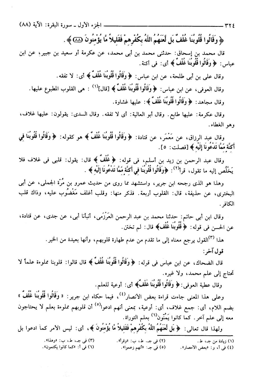 وَقَالَ عِكْرِمَةُ: عَلَيْهَا طَابَعٌ. وَقَالَ أَبُو الْعَالِيَةِ: أَيْ لَا تَفْقَهُ. وَقَالَ السُّدِّيُّ: يَقُولُونَ: عَلَيْهَا غِلَافٌ، وَهُوَ الْغِطَاءُ.