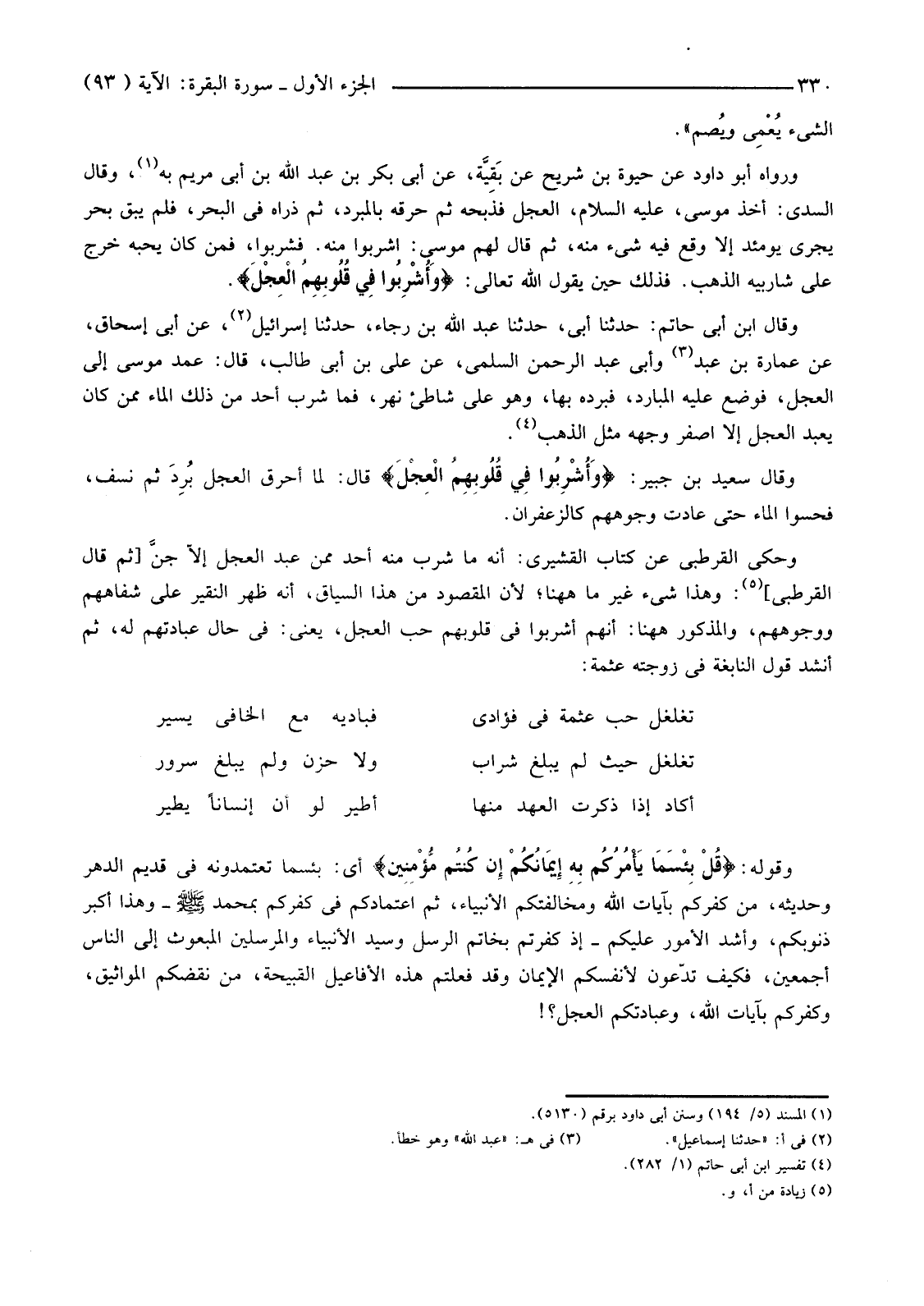 وَحَكَى الْقُرْطُبِيُّ عَنْ كِتَابِ الْقُشَيْرِيِّ: أَنَّهُ مَا شَرِبَ مِنْهُ أَحَدٌ مِمَّنْ عَبَدَ الْعِجْلَ إِلَّا جنَّ [ثُمَّ قَالَ الْقُرْطُبِيُّ] (5) وَهَذَا شَيْءٌ غَيْرُ مَا هَاهُنَا؛ لِأَنَّ الْمَقْصُودَ مِنْ هَذَا السِّيَاقِ، أَنَّهُ ظَهَرَ النَّقِيرُ عَلَى شِفَاهِهِمْ وَوُجُوهِهِمْ، وَالْمَذْكُورُ هَاهُنَا: أَنَّهُمْ أُشْرِبُوا فِي قُلُوبِهِمْ حُبَّ الْعِجْلِ، يَعْنِي: فِي حَالِ عِبَادَتِهِمْ لَهُ، ثُمَّ أَنْشَدَ قَوْلَ النَّابِغَةِ فِي زَوْجَتِهِ عَثْمَةَ: