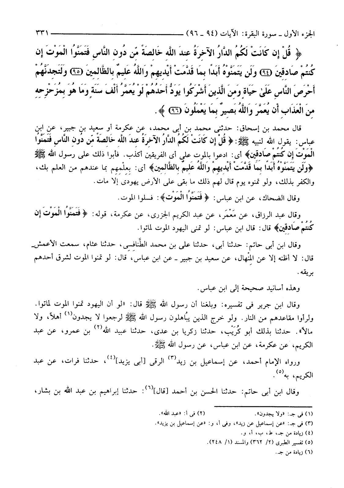 قَالَ مُحَمَّدُ بْنُ إِسْحَاقَ: حَدَّثَنِي مُحَمَّدُ بْنُ أَبِي مُحَمَّدٍ، عَنْ عِكْرِمَةَ أَوْ سَعِيدِ بْنِ جُبَيْرٍ، عَنِ ابْنِ عَبَّاسٍ: يَقُولُ اللَّهُ لَنَبِيِّهِ صَلَّى اللَّهُ عَلَيْهِ وَسَلَّمَ: {قُلْ إِنْ كَانَتْ لَكُمُ الدَّارُ الآخِرَةُ عِنْدَ اللَّهِ خَالِصَةً مِنْ دُونِ النَّاسِ فَتَمَنَّوُا الْمَوْتَ إِنْ كُنْتُمْ صَادِقِينَ} أَيِ: ادْعُوا بِالْمَوْتِ عَلَى أَيِّ الْفَرِيقَيْنِ أَكْذَبَ. فَأَبَوْا ذَلِكَ عَلَى رَسُولِ اللَّهِ صَلَّى اللَّهُ عَلَيْهِ وَسَلَّمَ {وَلَنْ يَتَمَنَّوْهُ أَبَدًا بِمَا قَدَّمَتْ أَيْدِيهِمْ وَاللَّهُ عَلِيمٌ بِالظَّالِمِينَ} أَيْ: بِعِلْمِهِم بِمَا عِنْدَهُمْ مِنَ الْعِلْمِ بِكَ، وَالْكُفْرِ بِذَلِكَ، وَلَوْ تَمَنَّوْهُ يَوْمَ قَالَ لَهُمْ ذَلِكَ مَا بَقِيَ عَلَى الْأَرْضِ يَهُودِيٌّ إِلَّا مَاتَ.