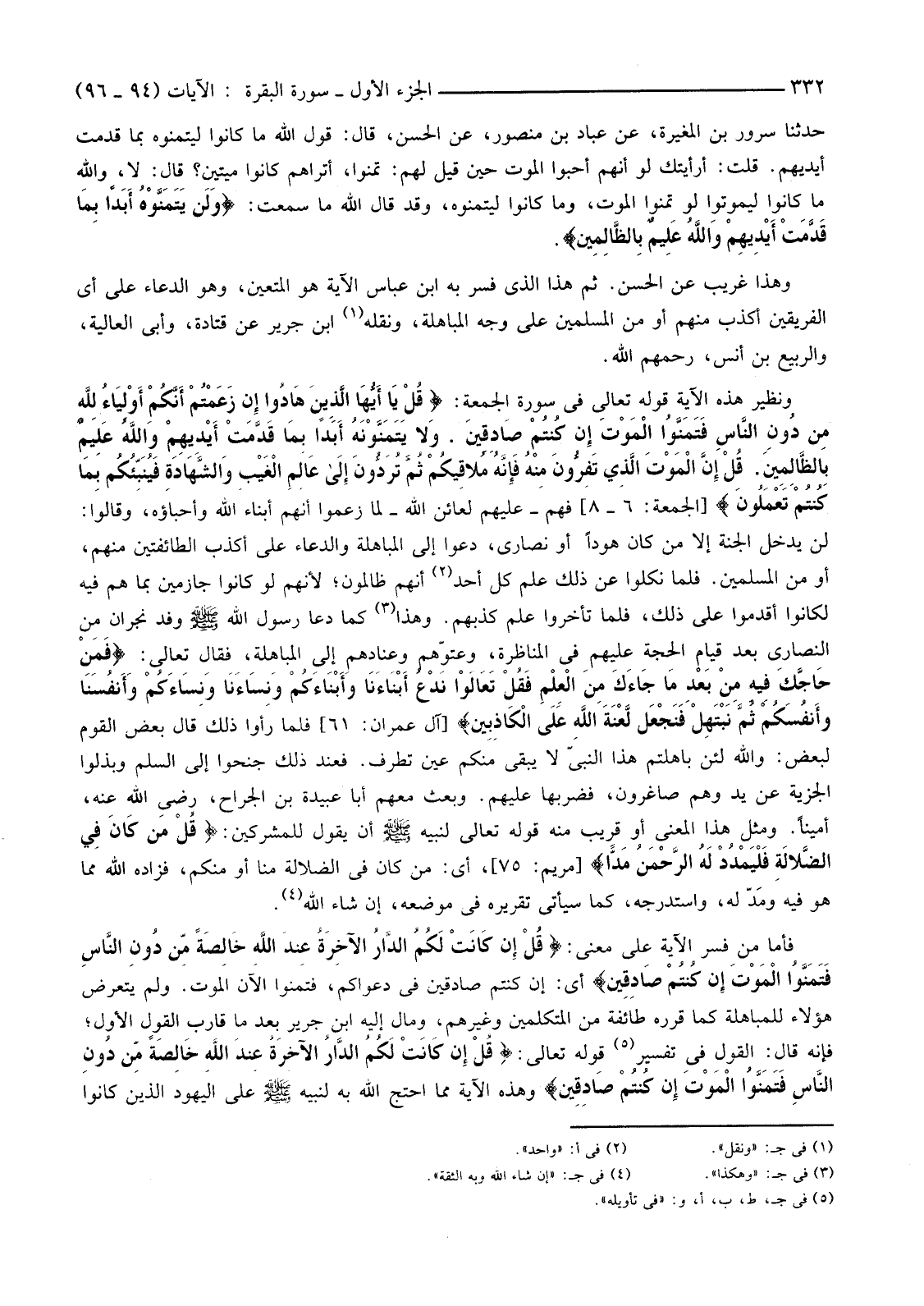 فَأَمَّا مَنْ فَسَّرَ الْآيَةَ عَلَى مَعْنَى: {قُلْ إِنْ كَانَتْ لَكُمُ الدَّارُ الآخِرَةُ عِنْدَ اللَّهِ خَالِصَةً مِنْ دُونِ النَّاسِ فَتَمَنَّوُا الْمَوْتَ إِنْ كُنْتُمْ صَادِقِينَ} أي: إِنْ كُنْتُمْ صَادِقِينَ فِي دَعْوَاكُمْ، فَتَمَنَّوُا الْآنَ الْمَوْتَ. وَلَمْ يَتَعَرَّضْ هَؤُلَاءِ لِلْمُبَاهَلَةِ كَمَا قَرَّرَهُ طَائِفَةٌ مِنَ الْمُتَكَلِّمِينَ وَغَيْرِهِمْ، وَمَالَ إِلَيْهِ ابْنُ جَرِيرٍ بَعْدَ مَا قَارَبَ الْقَوْلَ الْأَوَّلَ؛ فَإِنَّهُ قَالَ: الْقَوْلُ فِي تَفْسِيرِ (5) قَوْلِهِ تَعَالَى: {قُلْ إِنْ كَانَتْ لَكُمُ الدَّارُ الآخِرَةُ عِنْدَ اللَّهِ خَالِصَةً مِنْ دُونِ النَّاسِ فَتَمَنَّوُا الْمَوْتَ إِنْ كُنْتُمْ صَادِقِينَ} وَهَذِهِ الْآيَةُ مِمَّا احْتَجَّ اللَّهُ بِهِ لَنَبِيِّهِ صَلَّى اللَّهُ عَلَيْهِ وَسَلَّمَ عَلَى اليهود الذين كانوا