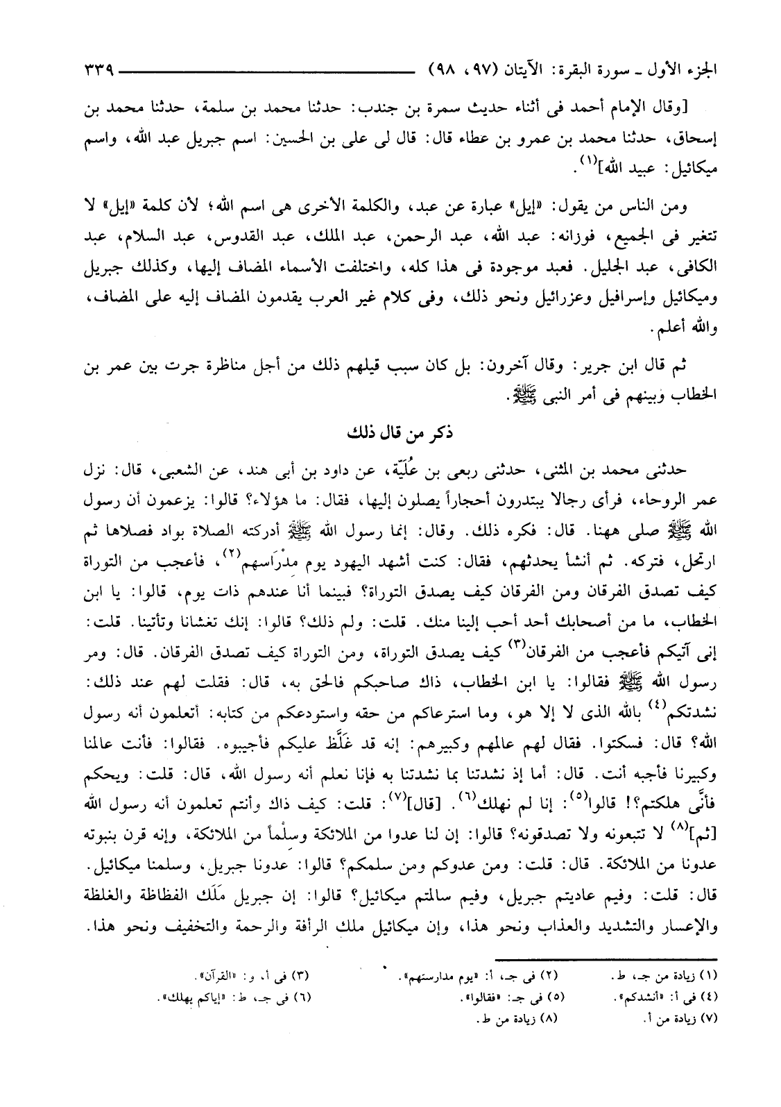[وَقَالَ الْإِمَامُ أَحْمَدُ فِي أَثْنَاءِ حَدِيثِ سَمُرَةَ بْنِ جُنْدُبٍ: حَدَّثَنَا مُحَمَّدُ بْنُ سَلَمَةَ، حَدَّثَنَا مُحَمَّدُ بْنُ إِسْحَاقَ، حَدَّثَنَا مُحَمَّدُ بْنُ عَمْرِو بْنِ عَطَاءٍ قَالَ: قَالَ لِي عَلِيُّ بْنُ الْحُسَيْنِ: اسْمُ جِبْرِيلَ عَبْدُ اللَّهِ، وَاسْمُ مِيكَائِيلَ: عُبَيْدُ اللَّهِ] (1) .