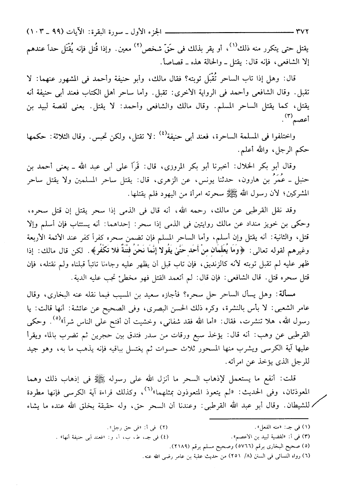 قَالَ: وَهَلْ إِذَا تَابَ السَّاحِرُ تُقْبَلُ تَوْبَتُهُ؟ فَقَالَ مَالِكٌ، وَأَبُو حَنِيفَةَ وَأَحْمَدُ فِي الْمَشْهُورِ عَنْهُمَا: لَا تُقْبَلُ. وَقَالَ الشَّافِعِيُّ وَأَحْمَدُ فِي الرِّوَايَةِ الْأُخْرَى: تُقْبَلُ. وَأَمَّا سَاحِرُ أَهْلِ الْكِتَابِ فَعِنْدَ أَبِي حَنِيفَةَ أَنَّهُ يُقْتَلُ، كَمَا يُقْتَلُ السَّاحِرُ الْمُسْلِمُ. وَقَالَ مَالِكٌ وَالشَّافِعِيُّ وَأَحْمَدُ: لَا يُقْتَلُ. يَعْنِي لقصة لبيد بن أعصم (3) .