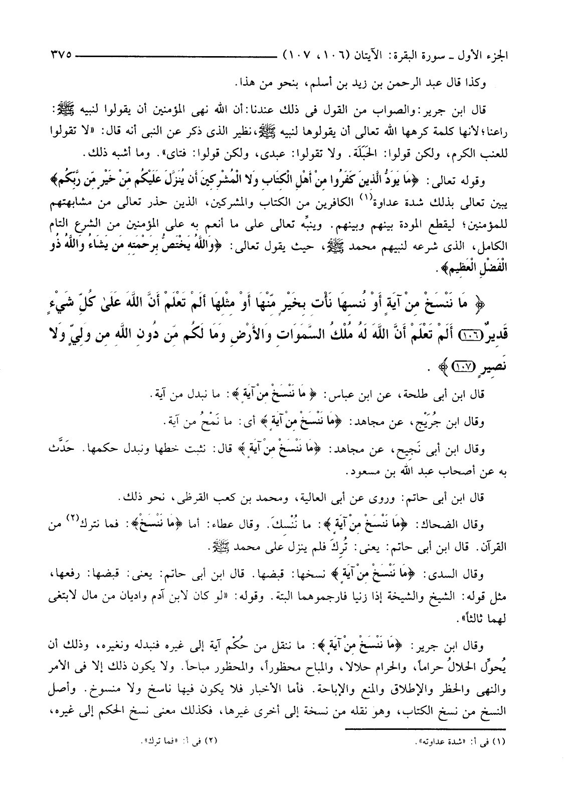 {مَا نَنْسَخْ مِنْ آيَةٍ أَوْ نُنْسِهَا نَأْتِ بِخَيْرٍ مِنْهَا أَوْ مِثْلِهَا أَلَمْ تَعْلَمْ أَنَّ اللَّهَ عَلَى كُلِّ شَيْءٍ قَدِيرٌ (106) أَلَمْ تَعْلَمْ أَنَّ اللَّهَ لَهُ مُلْكُ السَّمَاوَاتِ وَالأرْضِ وَمَا لَكُمْ مِنْ دُونِ اللَّهِ مِنْ وَلِيٍّ وَلا نَصِيرٍ (107) }