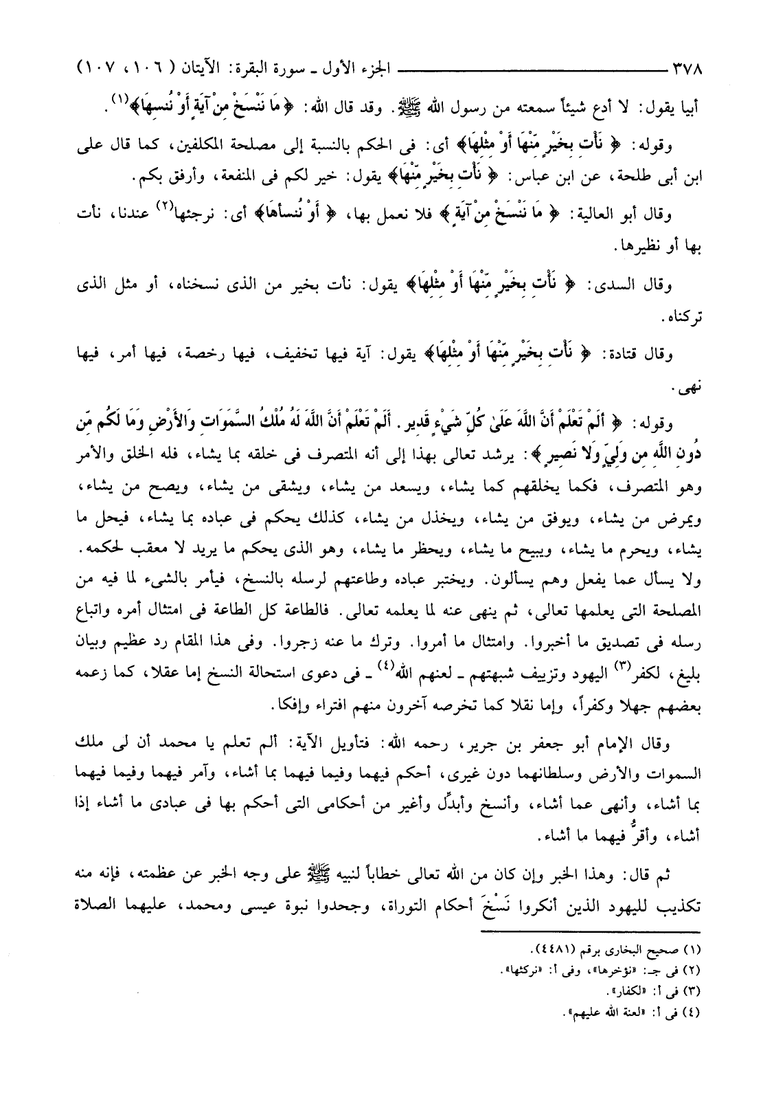 وَقَوْلُهُ: {أَلَمْ تَعْلَمْ أَنَّ اللَّهَ عَلَى كُلِّ شَيْءٍ قَدِيرٌ* أَلَمْ تَعْلَمْ أَنَّ اللَّهَ لَهُ مُلْكُ السَّمَاوَاتِ وَالأرْضِ وَمَا لَكُمْ مِنْ دُونِ اللَّهِ مِنْ وَلِيٍّ وَلا نَصِيرٍ} يُرْشِدُ تَعَالَى بِهَذَا إِلَى أَنَّهُ الْمُتَصَرِّفُ فِي خَلْقِهِ بِمَا يَشَاءُ، فَلَهُ الْخَلْقُ وَالْأَمْرُ وَهُوَ الْمُتَصَرِّفُ، فَكَمَا خَلَقَهُمْ كَمَا يَشَاءُ، وَيُسْعِدُ مَنْ يَشَاءُ، وَيُشْقِي مَنْ يَشَاءُ، وَيُصِحُّ مَنْ يَشَاءُ، وَيُمْرِضُ مَنْ يَشَاءُ، وَيُوَفِّقُ مَنْ يَشَاءُ، وَيَخْذُلُ مَنْ يَشَاءُ، كَذَلِكَ يَحْكُمُ فِي عِبَادِهِ بِمَا يَشَاءُ، فَيَحِلُّ مَا يَشَاءُ، وَيُحَرِّمُ مَا يَشَاءُ، وَيُبِيحُ مَا يَشَاءُ، وَيَحْظُرُ مَا يَشَاءُ، وَهُوَ الذِي يَحْكُمُ مَا يُرِيدُ لَا مُعَقِّبَ لِحُكْمِهِ. وَلَا يُسْأَلُ عَمَّا يَفْعَلُ وَهُمْ يُسْأَلُونَ. وَيَخْتَبِرُ عِبَادَهُ وَطَاعَتَهُمْ لِرُسُلِهِ بِالنَّسْخِ، فَيَأْمُرُ بِالشَّيْءِ لِمَا فِيهِ مِنَ الْمَصْلَحَةِ التِي يَعْلَمُهَا تَعَالَى، ثُمَّ يَنْهَى عَنْهُ لِمَا يَعْلَمُهُ تَعَالَى.. فَالطَّاعَةُ كُلُّ الطَّاعَةِ فِي امْتِثَالِ أَمْرِهِ وَاتِّبَاعِ رُسُلِهِ فِي تَصْدِيقِ مَا أَخْبَرُوا. وَامْتِثَالِ مَا أَمَرُوا. وَتَرْكِ مَا عَنْهُ زَجَرُوا. وَفِي هَذَا الْمَقَامِ رَدٌّ عَظِيمٌ وَبَيَانٌ بَلِيغٌ لِكُفْرِ (3) الْيَهُودِ وَتَزْيِيفِ شُبْهَتِهِمْ -لَعَنَهُمُ اللَّهُ (4) -فِي دَعْوَى اسْتِحَالَةِ النَّسْخِ إِمَّا عَقْلًا كَمَا زَعَمَهُ بعضهم جهلا وكفرا، ً وَإِمَّا نَقْلًا كَمَا تَخَرَّصَهُ آخَرُونَ مِنْهُمُ افْتِرَاءً وَإِفْكًا.