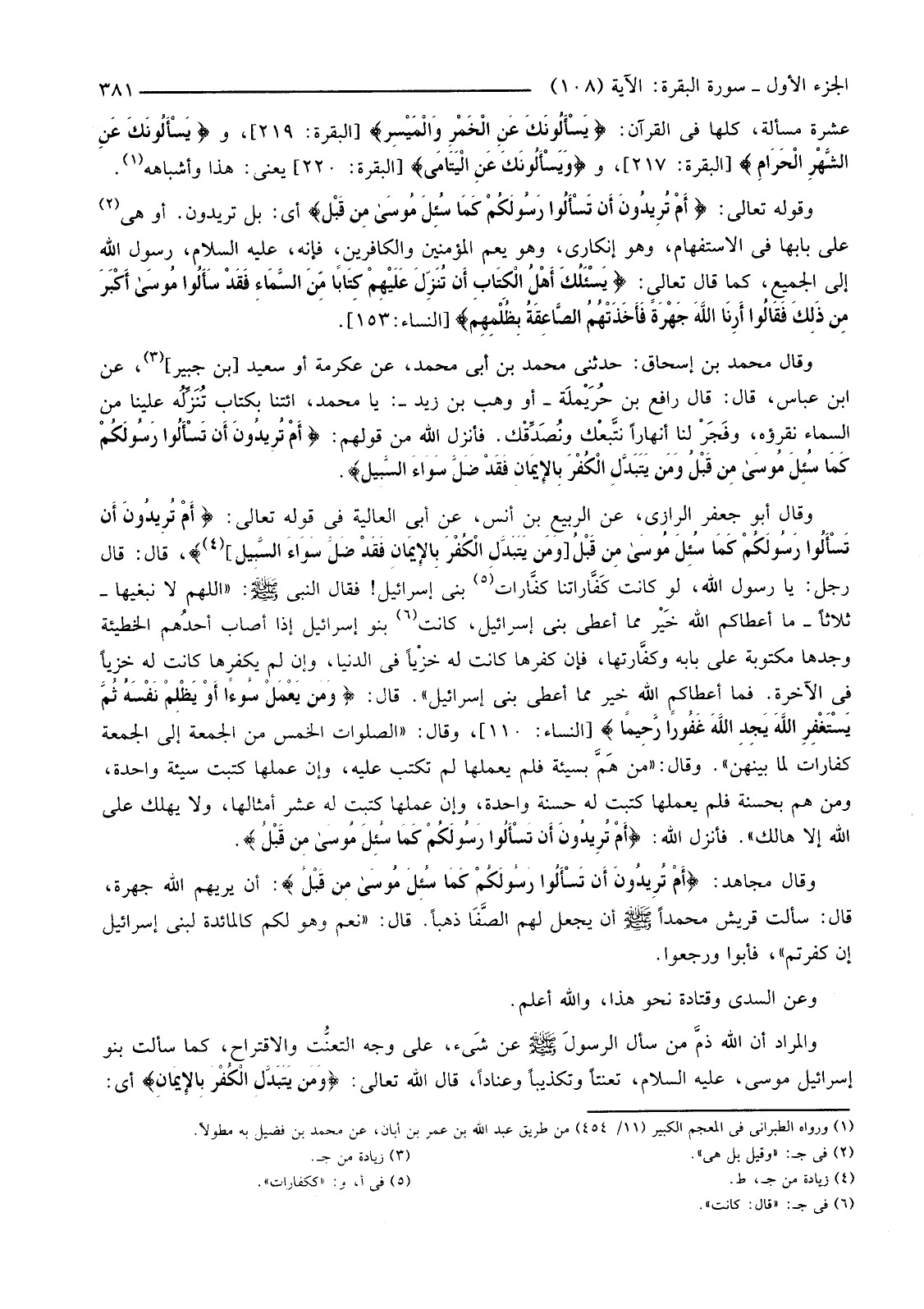 وَقَالَ مُجَاهِدٌ: {أَمْ تُرِيدُونَ أَنْ تَسْأَلُوا رَسُولَكُمْ كَمَا سُئِلَ مُوسَى مِنْ قَبْلُ} أَنْ يُرِيَهُمُ اللَّهَ جَهْرَةً، قَالَ: سَأَلَتْ قُرَيْشٌ مُحَمَّدًا صَلَّى اللَّهُ عَلَيْهِ وَسَلَّمَ أَنْ يَجْعَلَ لَهُمُ الصَّفَا ذَهَبًا. قَالَ: "نَعَمْ وَهُوَ لَكُمْ كَالْمَائِدَةِ لِبَنِي إِسْرَائِيلَ إِنْ كَفَرْتُمْ"، فَأَبَوْا وَرَجَعُوا.
