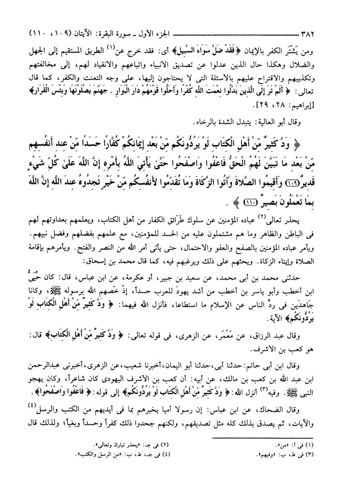يُحَذِّرُ تَعَالَى (2) عِبَادَهُ الْمُؤْمِنِينَ عَنْ سُلُوكِ طَرَائق الْكُفَّارِ مِنْ أَهْلِ الْكِتَابِ، وَيُعْلِمُهُمْ بِعَدَاوَتِهِمْ لَهُمْ فِي الْبَاطِنِ وَالظَّاهِرِ وَمَا هُمْ مُشْتَمِلُونَ عَلَيْهِ مِنَ الْحَسَدِ لِلْمُؤْمِنِينَ، مَعَ عِلْمِهِمْ بِفَضْلِهِمْ وَفَضْلِ نَبِيِّهِمْ. وَيَأْمُرُ عِبَادَهُ الْمُؤْمِنِينَ بِالصَّفْحِ وَالْعَفْوِ وَالِاحْتِمَالِ، حَتَّى يَأْتِيَ أَمْرُ اللَّهِ مِنَ النَّصْرِ وَالْفَتْحِ. وَيَأْمُرُهُمْ بِإِقَامَةِ الصَّلَاةِ وَإِيتَاءِ الزَّكَاةِ. وَيَحُثُّهُمْ عَلَى ذَلِكَ وَيُرَغِّبُهُمْ فِيهِ، كَمَا قَالَ مُحَمَّدُ بْنُ إِسْحَاقَ: حَدَّثَنِي مُحَمَّدُ بْنُ أَبِي مُحَمَّدٍ، عَنْ سَعِيدِ بْنِ جُبَيْرٍ، أَوْ عِكْرِمَةُ، عَنِ ابْنِ عباس، قال: كَانَ حُيَيُّ بْنُ أَخْطَبَ وَأَبُو يَاسِرِ بْنُ أَخْطَبَ مِنْ أَشَدِّ يهودَ لِلْعَرَبِ حَسَدًا، إذْ خَصهم اللَّهُ بِرَسُولِهِ صَلَّى اللَّهُ عَلَيْهِ وَسَلَّمَ وَكَانَا جَاهدَين فِي ردِّ النَّاسِ عَنِ الْإِسْلَامِ مَا اسْتَطَاعَا، فَأَنْزَلَ اللَّهُ فِيهِمَا: {وَدَّ كَثِيرٌ مِنْ أَهْلِ الْكِتَابِ لَوْ يَرُدُّونَكُمْ} الْآيَةَ.