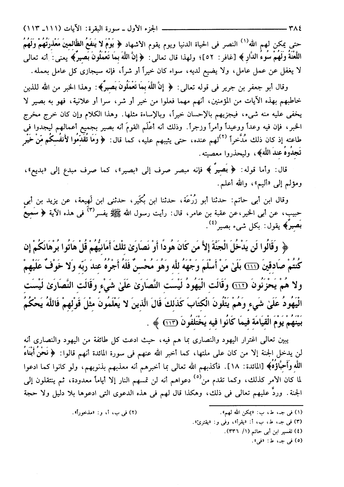 وَقَالَ أَبُو جَعْفَرِ بْنُ جَرِيرٍ فِي قَوْلِهِ تَعَالَى: {إِنَّ اللَّهَ بِمَا تَعْمَلُونَ بَصِيرٌ} وَهَذَا الْخَبَرُ مِنَ اللَّهِ لِلَّذِينَ خَاطَبَهُمْ بِهَذِهِ الْآيَاتِ مِنَ الْمُؤْمِنِينَ، أَنَّهُمْ مَهْمَا فَعَلُوا مِنْ خَيْرٍ أَوْ شَرٍّ، سِرًّا أَوْ عَلَانِيَةً، فَهُوَ بِهِ بَصِيرٌ لَا يَخْفَى عَلَيْهِ مِنْهُ شَيْءٌ، فَيَجْزِيهِمْ بِالْإِحْسَانِ خَيْرًا، وَبِالْإِسَاءَةِ مِثْلَهَا. وَهَذَا الْكَلَامُ وَإِنْ كَانَ خَرَجَ مَخْرَجَ الْخَبَرِ، فَإِنَّ فِيهِ وَعْدًا وَوَعِيدًا وَأَمْرًا وَزَجْرًا. وَذَلِكَ أَنَّهُ أعْلَم الْقَوْمَ أَنَّهُ بَصِيرٌ بِجَمِيعِ أَعْمَالِهِمْ لِيَجِدُّوا فِي طَاعَتِهِ إِذْ كَانَ ذَلِكَ مُدَّخرًا (2) لَهُمْ عِنْدَهُ، حَتَّى يُثِيبَهُمْ عَلَيْهِ، كَمَا قَالَ: {وَمَا تُقَدِّمُوا لأنْفُسِكُمْ مِنْ خَيْرٍ تَجِدُوهُ عِنْدَ اللَّهِ} وَلِيَحْذَرُوا مَعْصِيَتَهُ.