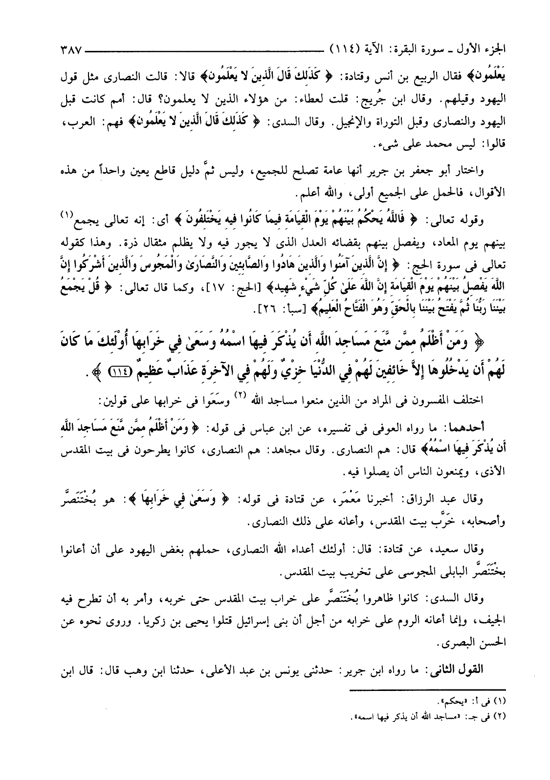 اخْتَلَفَ الْمُفَسِّرُونَ فِي الْمُرَادِ مِنَ الَّذِينَ مَنَعُوا مَسَاجِدَ اللَّهِ (2) وسَعَوا فِي خَرَابِهَا عَلَى قَوْلَيْنِ: