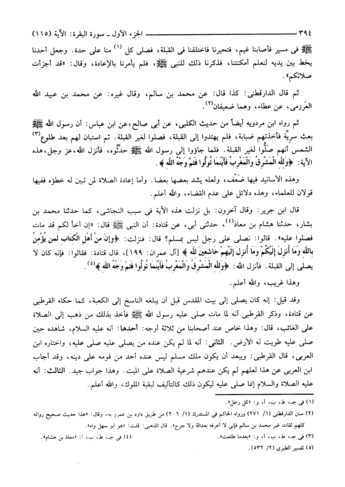 ثُمَّ رَوَاهُ ابْنُ مَرْدُويه أَيْضًا مِنْ حَدِيثِ الْكَلْبِيِّ، عَنْ أَبِي صَالِحٍ، عَنِ ابْنِ عَبَّاسٍ: إِنَّ رَسُولَ اللَّهِ صَلَّى اللَّهُ عَلَيْهِ وَسَلَّمَ بَعَثَ سرِيَّة فَأَخَذَتْهُمْ ضَبَابَةٌ، فَلَمْ يَهْتَدُوا إِلَى الْقِبْلَةِ، فَصَلَّوْا لِغَيْرِ الْقِبْلَةِ. ثُمَّ اسْتَبَانَ لَهُمْ بَعْدَ طُلُوعِ (3) الشَّمْسِ أَنَّهُمْ صلوا لغير القبلة. فلما جاؤوا إلى رسول الله صلى الله عليه وسلم حدَّثُوه، فَأَنْزَلَ اللَّهُ عَزَّ وَجَلَّ، هَذِهِ الْآيَةَ: {وَلِلَّهِ الْمَشْرِقُ وَالْمَغْرِبُ فَأَيْنَمَا تُوَلُّوا فَثَمَّ وَجْهُ اللَّهِ}