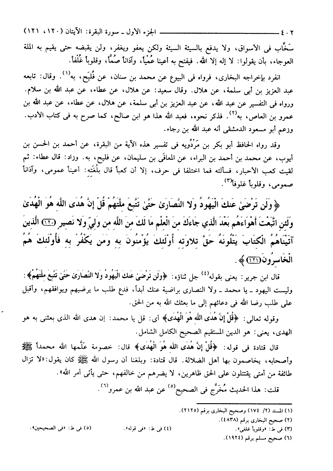 {وَلَنْ تَرْضَى عَنْكَ الْيَهُودُ وَلا النَّصَارَى حَتَّى تَتَّبِعَ مِلَّتَهُمْ قُلْ إِنَّ هُدَى اللَّهِ هُوَ الْهُدَى وَلَئِنِ اتَّبَعْتَ أَهْوَاءَهُمْ بَعْدَ الَّذِي جَاءَكَ مِنَ الْعِلْمِ مَا لَكَ مِنَ اللَّهِ مِنْ وَلِيٍّ وَلا نَصِيرٍ (120) الَّذِينَ آتَيْنَاهُمُ الْكِتَابَ يَتْلُونَهُ حَقَّ تِلاوَتِهِ أُولَئِكَ يُؤْمِنُونَ بِهِ وَمَنْ يَكْفُرْ بِهِ فَأُولَئِكَ هُمُ الْخَاسِرُونَ (121) }